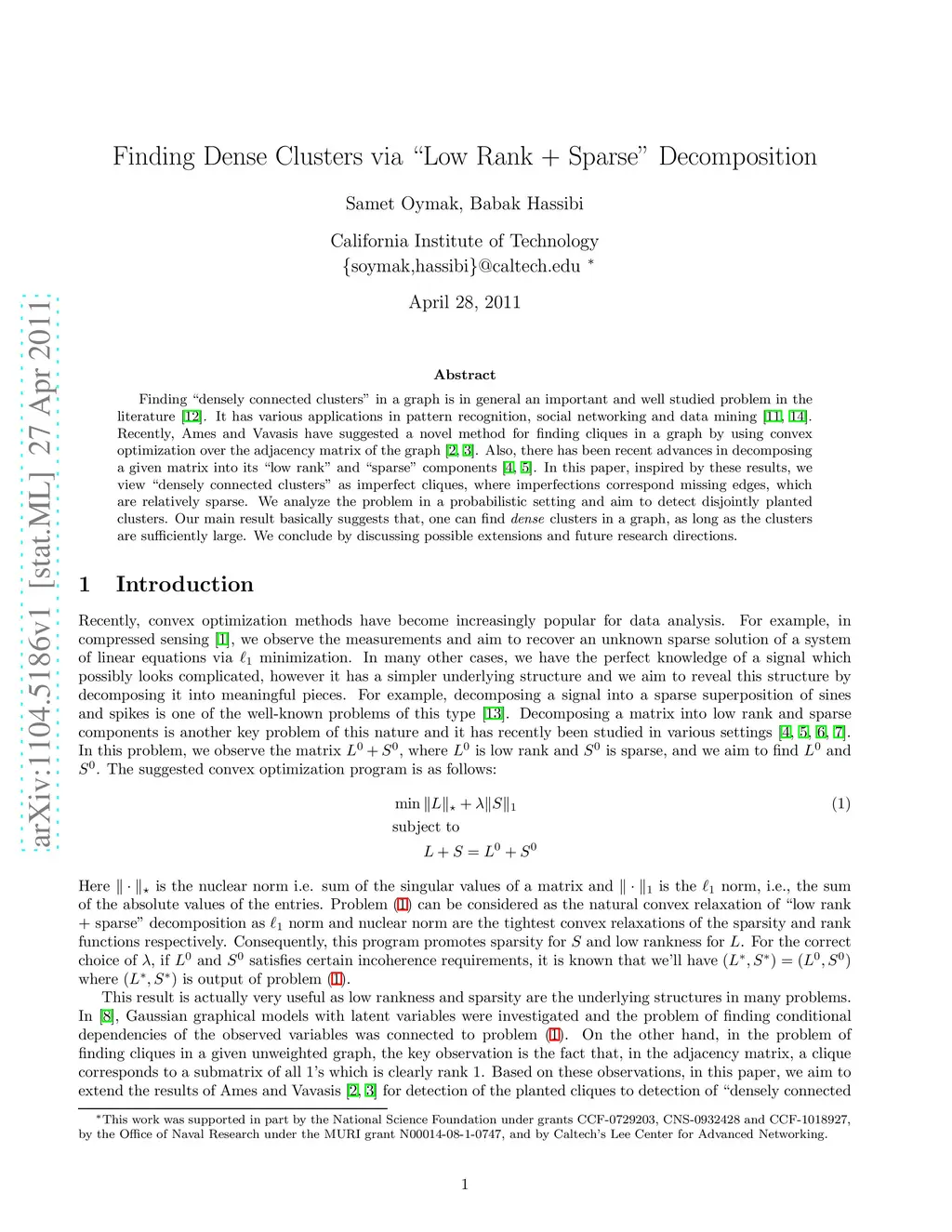 Finding "densely connected clusters" in a graph is in general an important and well studied problem in the literature \cite{Schaeffer}. It has various applications in pattern recognition, social networking and data mining \cite{Duda,Mishra}. Recently, Ames and Vavasis have suggested a novel method for finding cliques in a graph by using convex optimization over the adjacency matrix of the graph \cite{Ames, Ames2}. Also, there has been recent advances in decomposing a given matrix into its "low rank" and "sparse" components \cite{Candes, Chandra}. In this paper, inspired by these results, we view "densely connected clusters" as imperfect cliques, where imperfections correspond missing edges, which are relatively sparse. We analyze the problem in a probabilistic setting and aim to detect disjointly planted clusters. Our main result basically suggests that, one can find \emph{dense} clusters in a graph, as long as the clusters are sufficiently large. We conclude by discussing possible extensions and future research directions.