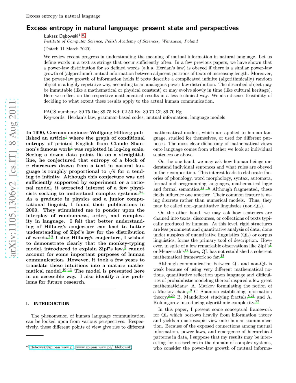 Excess entropy in natural language: present state and perspectives