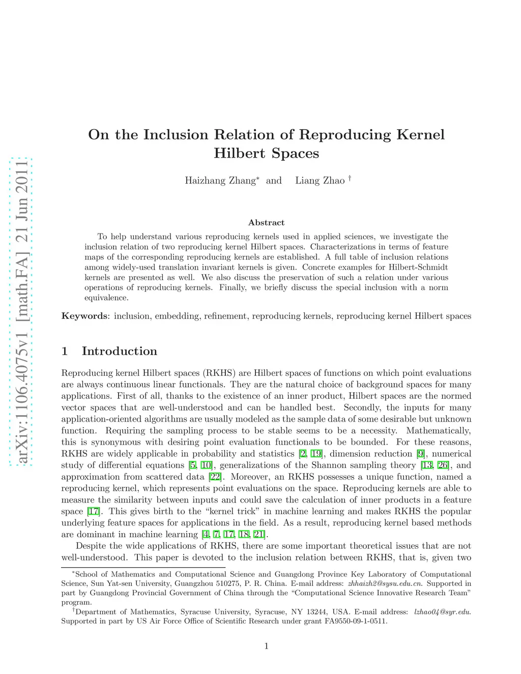 To help understand various reproducing kernels used in applied sciences, we investigate the inclusion relation of two reproducing kernel Hilbert spaces. Characterizations in terms of feature maps of the corresponding reproducing kernels are established. A full table of inclusion relations among widely-used translation invariant kernels is given. Concrete examples for Hilbert-Schmidt kernels are presented as well. We also discuss the preservation of such a relation under various operations of reproducing kernels. Finally, we briefly discuss the special inclusion with a norm equivalence.