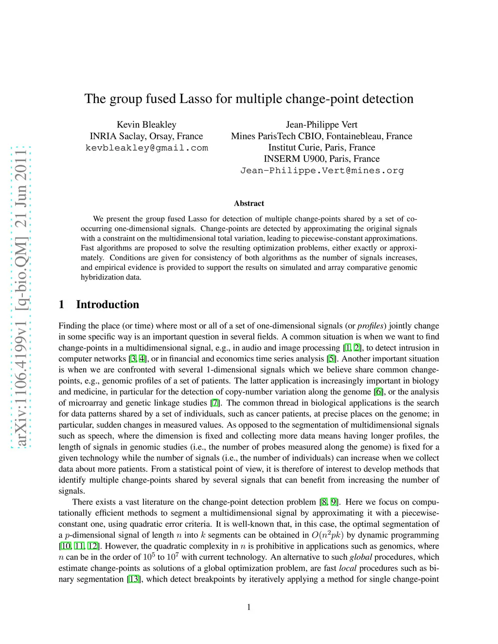 We present the group fused Lasso for detection of multiple change-points shared by a set of co-occurring one-dimensional signals. Change-points are detected by approximating the original signals with a constraint on the multidimensional total variation, leading to piecewise-constant approximations. Fast algorithms are proposed to solve the resulting optimization problems, either exactly or approximately. Conditions are given for consistency of both algorithms as the number of signals increases, and empirical evidence is provided to support the results on simulated and array comparative genomic hybridization data.