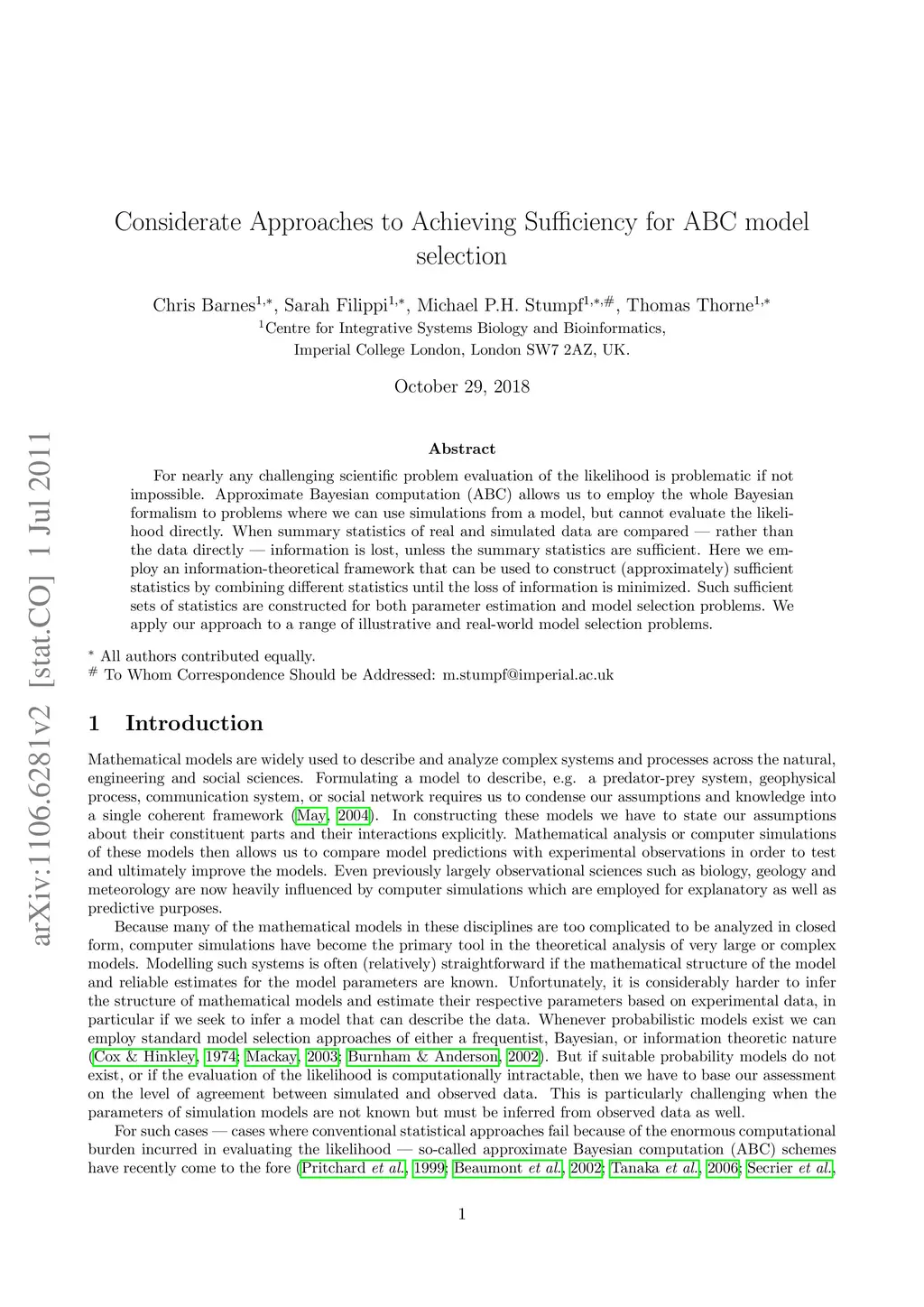 For nearly any challenging scientific problem evaluation of the likelihood is problematic if not impossible. Approximate Bayesian computation (ABC) allows us to employ the whole Bayesian formalism to problems where we can use simulations from a model, but cannot evaluate the likelihood directly. When summary statistics of real and simulated data are compared --- rather than the data directly --- information is lost, unless the summary statistics are sufficient. Here we employ an information-theoretical framework that can be used to construct (approximately) sufficient statistics by combining different statistics until the loss of information is minimized. Such sufficient sets of statistics are constructed for both parameter estimation and model selection problems. We apply our approach to a range of illustrative and real-world model selection problems.
