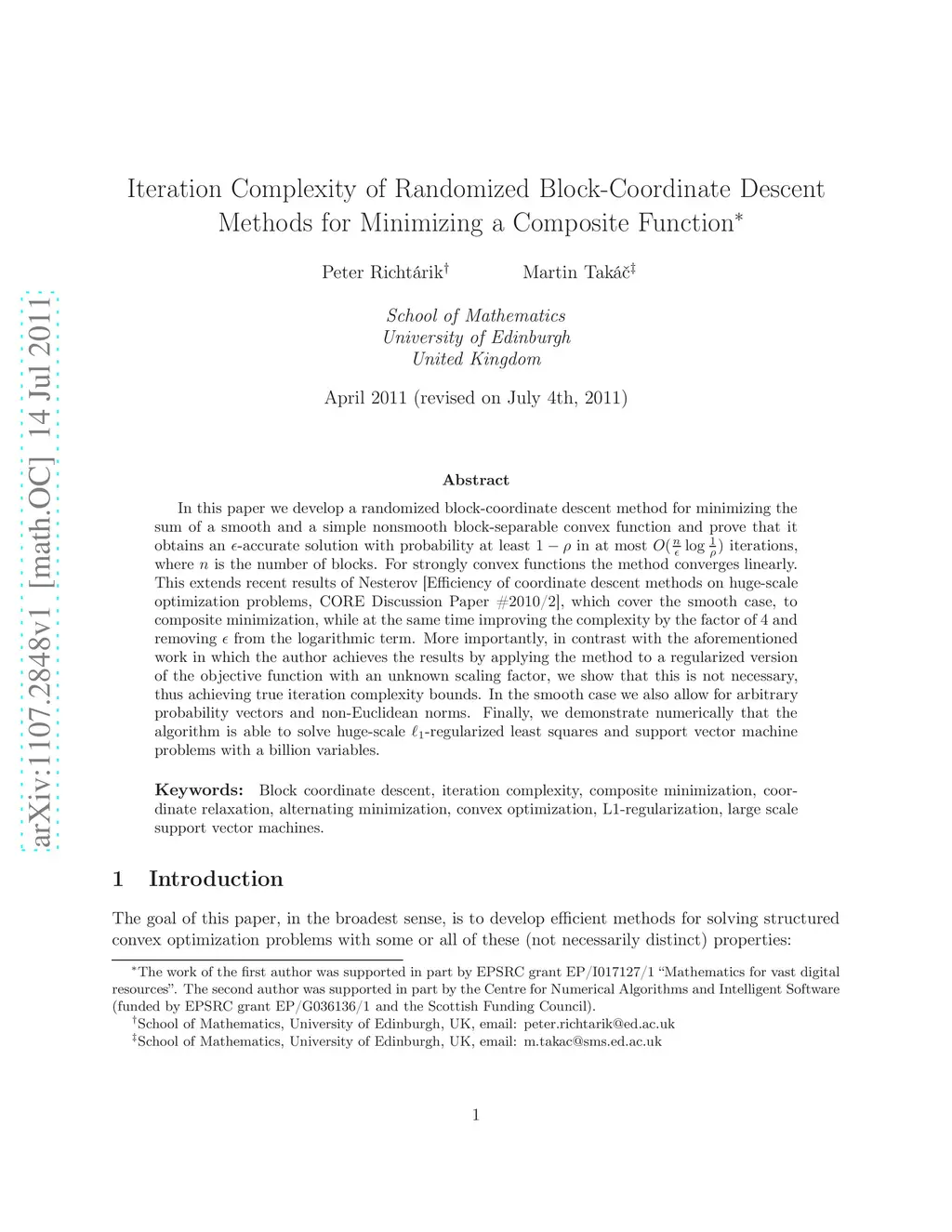 In this paper we develop a randomized block-coordinate descent method for minimizing the sum of a smooth and a simple nonsmooth block-separable convex function and prove that it obtains an -accurate solution with probability at least in at most iterations, where is the number of blocks. For strongly convex functions the method converges linearly. This extends recent results of Nesterov [Efficiency of coordinate descent methods on huge-scale optimization problems, CORE Discussion Paper #2010/2], which cover the smooth case, to composite minimization, while at the same time improving the complexity by the factor of 4 and removing from the logarithmic term. More importantly, in contrast with the aforementioned work in which the author achieves the results by applying the method to a regularized version of the objective function with an unknown scaling factor, we show that this is not necessary, thus achieving true iteration complexity bounds. In the smooth case we also allow for arbitrary probability vectors and non-Euclidean norms. Finally, we demonstrate numerically that the algorithm is able to solve huge-scale -regularized least squares and support vector machine problems with a billion variables.