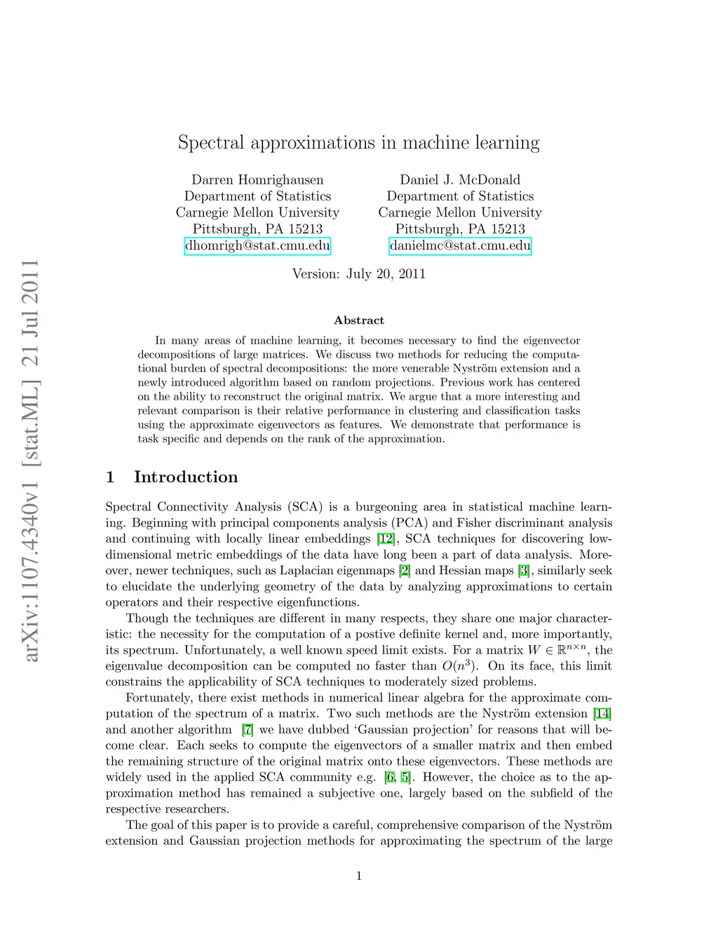 In many areas of machine learning, it becomes necessary to find the eigenvector decompositions of large matrices. We discuss two methods for reducing the computational burden of spectral decompositions: the more venerable Nystom extension and a newly introduced algorithm based on random projections. Previous work has centered on the ability to reconstruct the original matrix. We argue that a more interesting and relevant comparison is their relative performance in clustering and classification tasks using the approximate eigenvectors as features. We demonstrate that performance is task specific and depends on the rank of the approximation.