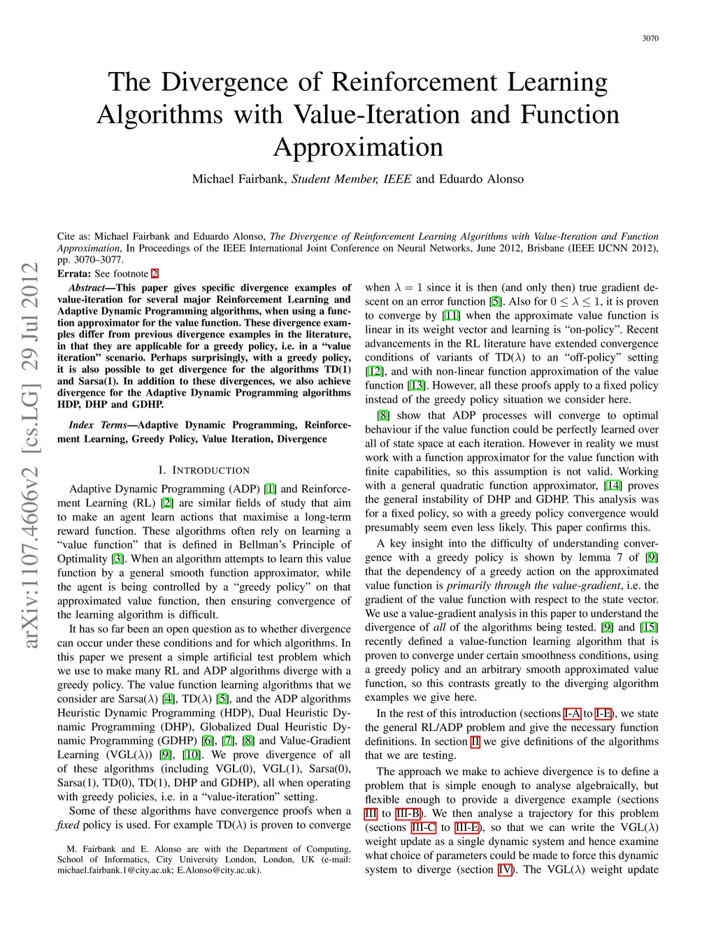 This paper gives specific divergence examples of value-iteration for several major Reinforcement Learning and Adaptive Dynamic Programming algorithms, when using a function approximator for the value function. These divergence examples differ from previous divergence examples in the literature, in that they are applicable for a greedy policy, i.e. in a "value iteration" scenario. Perhaps surprisingly, with a greedy policy, it is also possible to get divergence for the algorithms TD(1) and Sarsa(1). In addition to these divergences, we also achieve divergence for the Adaptive Dynamic Programming algorithms HDP, DHP and GDHP.