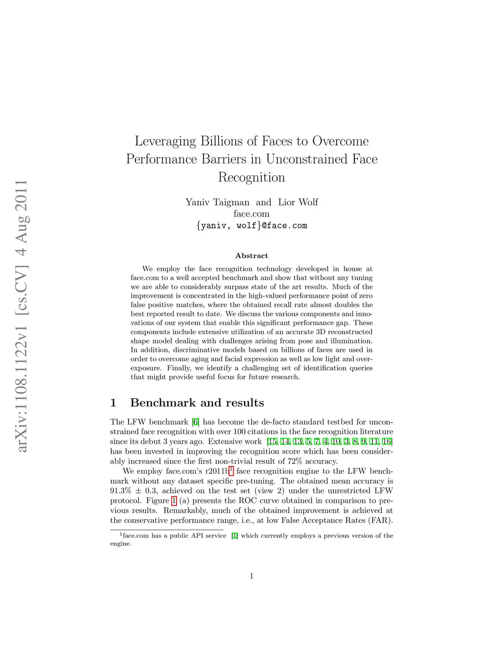 We employ the face recognition technology developed in house at face.com to a well accepted benchmark and show that without any tuning we are able to considerably surpass state of the art results. Much of the improvement is concentrated in the high-valued performance point of zero false positive matches, where the obtained recall rate almost doubles the best reported result to date. We discuss the various components and innovations of our system that enable this significant performance gap. These components include extensive utilization of an accurate 3D reconstructed shape model dealing with challenges arising from pose and illumination. In addition, discriminative models based on billions of faces are used in order to overcome aging and facial expression as well as low light and overexposure. Finally, we identify a challenging set of identification queries that might provide useful focus for future research.