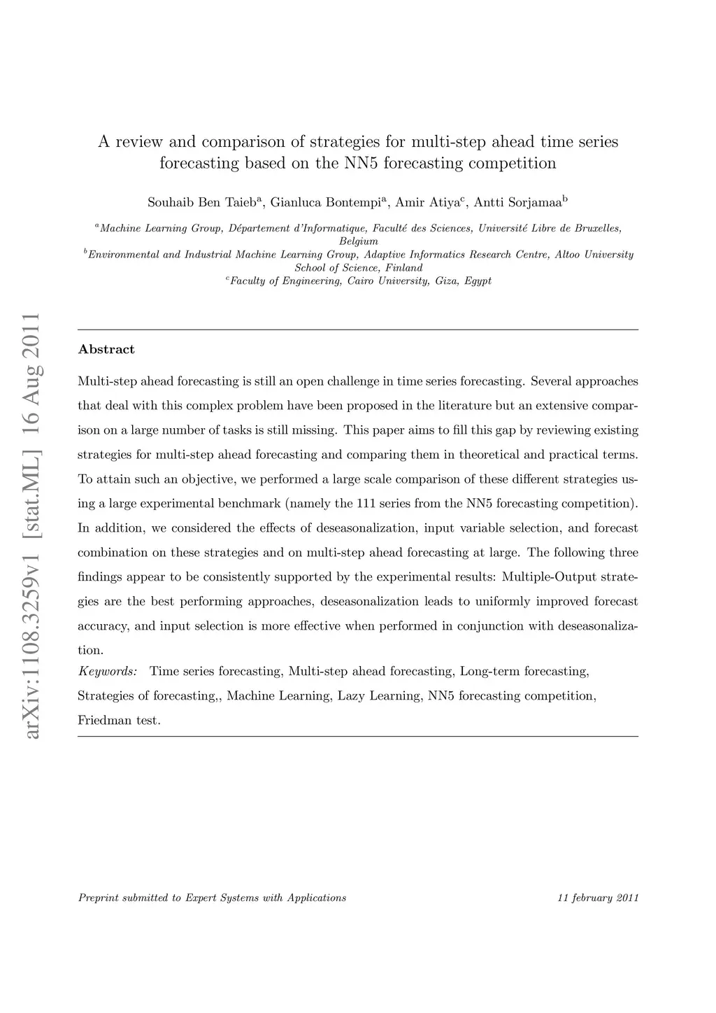 Multi-step ahead forecasting is still an open challenge in time series forecasting. Several approaches that deal with this complex problem have been proposed in the literature but an extensive comparison on a large number of tasks is still missing. This paper aims to fill this gap by reviewing existing strategies for multi-step ahead forecasting and comparing them in theoretical and practical terms. To attain such an objective, we performed a large scale comparison of these different strategies using a large experimental benchmark (namely the 111 series from the NN5 forecasting competition). In addition, we considered the effects of deseasonalization, input variable selection, and forecast combination on these strategies and on multi-step ahead forecasting at large. The following three findings appear to be consistently supported by the experimental results: Multiple-Output strategies are the best performing approaches, deseasonalization leads to uniformly improved forecast accuracy, and input selection is more effective when performed in conjunction with deseasonalization.