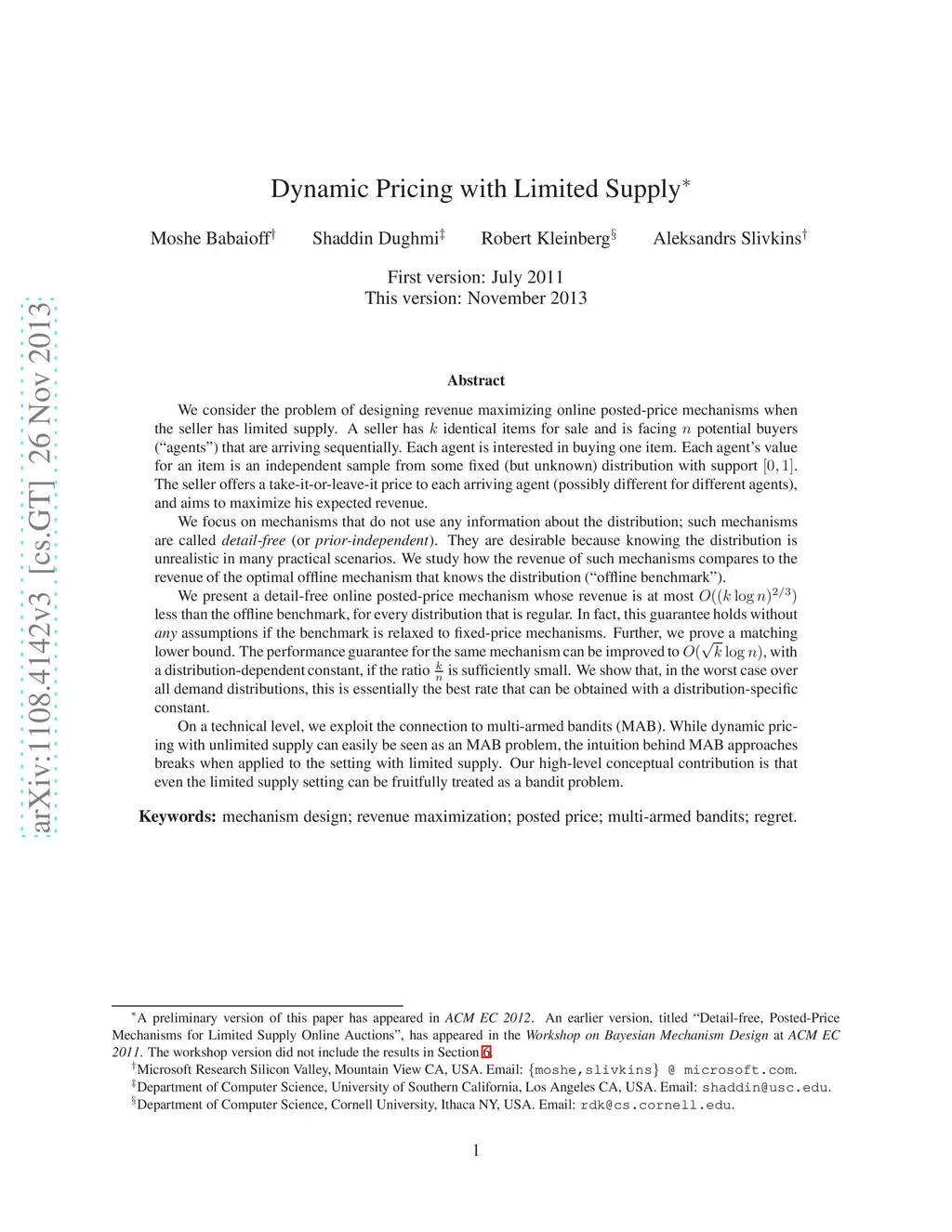 We consider the problem of dynamic pricing with limited supply. A seller has identical items for sale and is facing potential buyers ("agents") that are arriving sequentially. Each agent is interested in buying one item. Each agent's value for an item is an IID sample from some fixed distribution with support . The seller offers a take-it-or-leave-it price to each arriving agent (possibly different for different agents), and aims to maximize his expected revenue. We focus on "prior-independent" mechanisms -- ones that do not use any information about the distribution. They are desirable because knowing the distribution is unrealistic in many practical scenarios. We study how the revenue of such mechanisms compares to the revenue of the optimal offline mechanism that knows the distribution ("offline benchmark"). We present a prior-independent dynamic pricing mechanism whose revenue is at most less than the offline benchmark, for every distribution that is regular. In fact, this guarantee holds without *any* assumptions if the benchmark is relaxed to fixed-price mechanisms. Further, we prove a matching lower bound. The performance guarantee for the same mechanism can be improved to , with a distribution-dependent constant, if is sufficiently small. We show that, in the worst case over all demand distributions, this is essentially the best rate that can be obtained with a distribution-specific constant. On a technical level, we exploit the connection to multi-armed bandits (MAB). While dynamic pricing with unlimited supply can easily be seen as an MAB problem, the intuition behind MAB approaches breaks when applied to the setting with limited supply. Our high-level conceptual contribution is that even the limited supply setting can be fruitfully treated as a bandit problem.