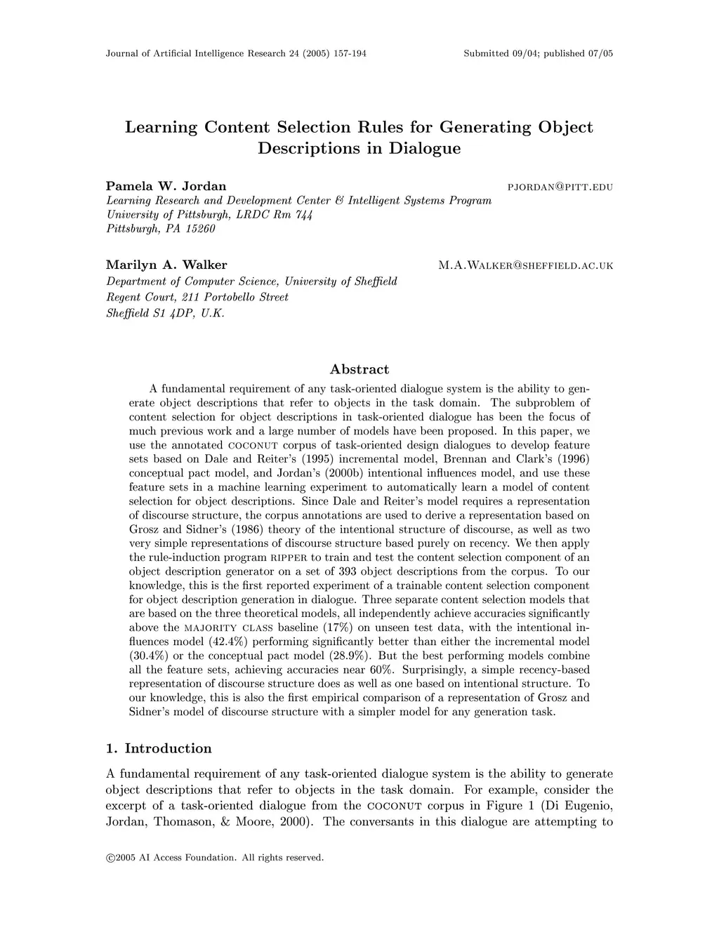 A fundamental requirement of any task-oriented dialogue system is the ability to generate object descriptions that refer to objects in the task domain. The subproblem of content selection for object descriptions in task-oriented dialogue has been the focus of much previous work and a large number of models have been proposed. In this paper, we use the annotated COCONUT corpus of task-oriented design dialogues to develop feature sets based on Dale and Reiters (1995) incremental model, Brennan and Clarks (1996) conceptual pact model, and Jordans (2000b) intentional influences model, and use these feature sets in a machine learning experiment to automatically learn a model of content selection for object descriptions. Since Dale and Reiters model requires a representation of discourse structure, the corpus annotations are used to derive a representation based on Grosz and Sidners (1986) theory of the intentional structure of discourse, as well as two very simple representations of discourse structure based purely on recency. We then apply the rule-induction program RIPPER to train and test the content selection component of an object description generator on a set of 393 object descriptions from the corpus. To our knowledge, this is the first reported experiment of a trainable content selection component for object description generation in dialogue. Three separate content selection models that are based on the three theoretical models, all independently achieve accuracies significantly above the majority class baseline (17%) on unseen test data, with the intentional influences model (42.4%) performing significantly better than either the incremental model (30.4%) or the conceptual pact model (28.9%). But the best performing models combine all the feature sets, achieving accuracies near 60%. Surprisingly, a simple recency-based representation of discourse structure does as well as one based on intentional structure. To our knowledge, this is also the first empirical comparison of a representation of Grosz and Sidners model of discourse structure with a simpler model for any generation task.