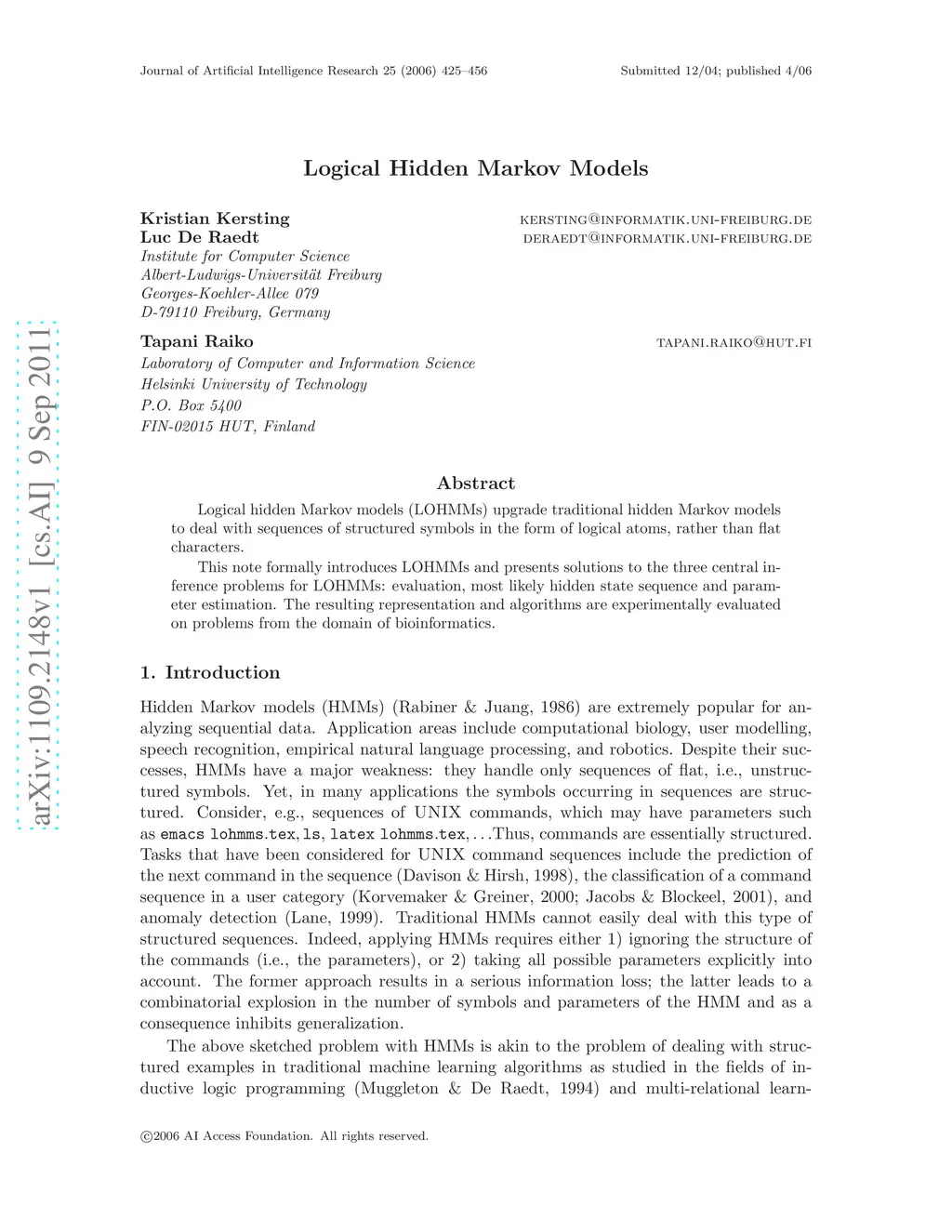 Logical hidden Markov models (LOHMMs) upgrade traditional hidden Markov models to deal with sequences of structured symbols in the form of logical atoms, rather than flat characters. This note formally introduces LOHMMs and presents solutions to the three central inference problems for LOHMMs: evaluation, most likely hidden state sequence and parameter estimation. The resulting representation and algorithms are experimentally evaluated on problems from the domain of bioinformatics.