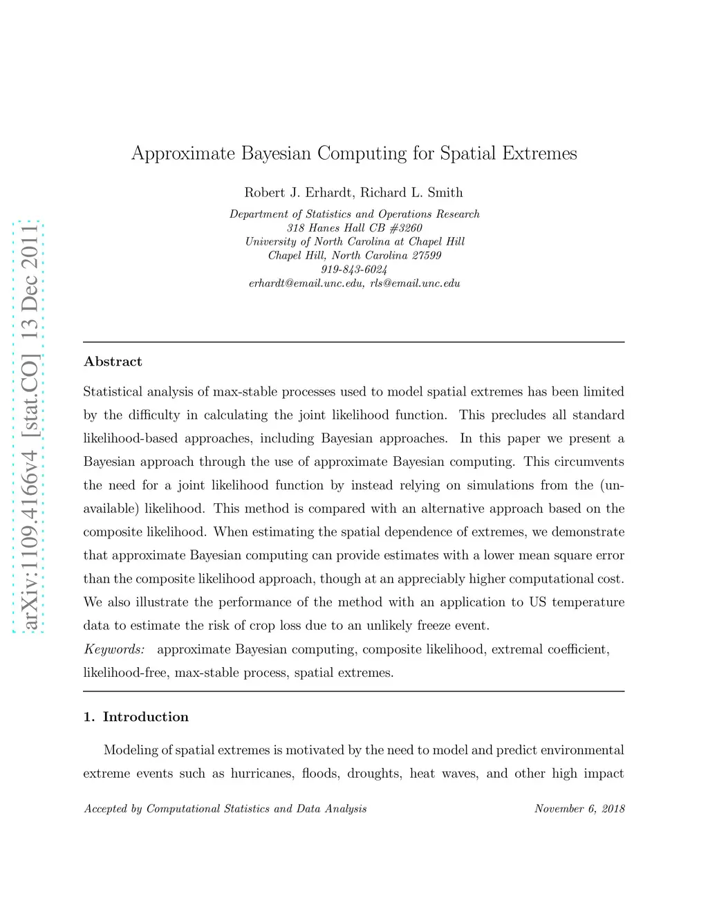 Statistical analysis of max-stable processes used to model spatial extremes has been limited by the difficulty in calculating the joint likelihood function. This precludes all standard likelihood-based approaches, including Bayesian approaches. In this paper we present a Bayesian approach through the use of approximate Bayesian computing. This circumvents the need for a joint likelihood function by instead relying on simulations from the (unavailable) likelihood. This method is compared with an alternative approach based on the composite likelihood. We demonstrate that approximate Bayesian computing can result in a lower mean square error than the composite likelihood approach when estimating the spatial dependence of extremes, though at an appreciably higher computational cost. We also illustrate the performance of the method with an application to US temperature data to estimate the risk of crop loss due to an unlikely freeze event.