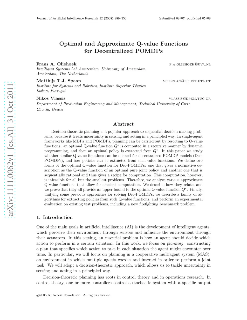 Optimal and Approximate Q-value Functions for Decentralized POMDPs