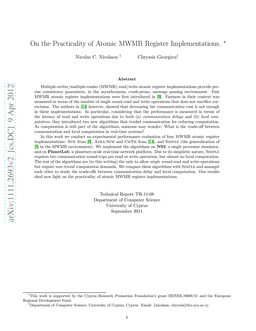Multiple-writer/multiple-reader (MWMR) atomic register implementations provide precise consistency guarantees, in the asynchronous, crash-prone, message passing environment. Fast MWMR atomic register implementations were first introduced in Englert et al. 2009. Fastness is measured in terms of the number of single round read and write operations that does not sacrifice correctness. In Georgiou et al. 2011 was shown, however, that decreasing the communication cost is not enough in these implementations. In particular, considering that the performance is measured in terms of the latency of read and write operations due to both (a) communication delays and (b)local computation, they introduced two new algorithms that traded communication for reducing computation. As computation is still part of the algorithms, someone may wonder: What is the trade-off between communication and local computation in real-time systems? In this work we conduct an experimental performance evaluation of four MWMR atomic register implementations: SFW from Englert et al. 2009, APRX-SFW and CWFR from Georgiou at al. 2011, and the generalization of the traditional algorithm of Attiya et al. 1996 in the MWMR environment, which we call SIMPLE. We implement and evaluate the algorithms on NS2, a single-processor simulator, and on PlanetLab, a planetary-scale real-time network platform. Our comparison provides an empirical answer to the above question and demonstrates the practicality of atomic MWMR register implementations.