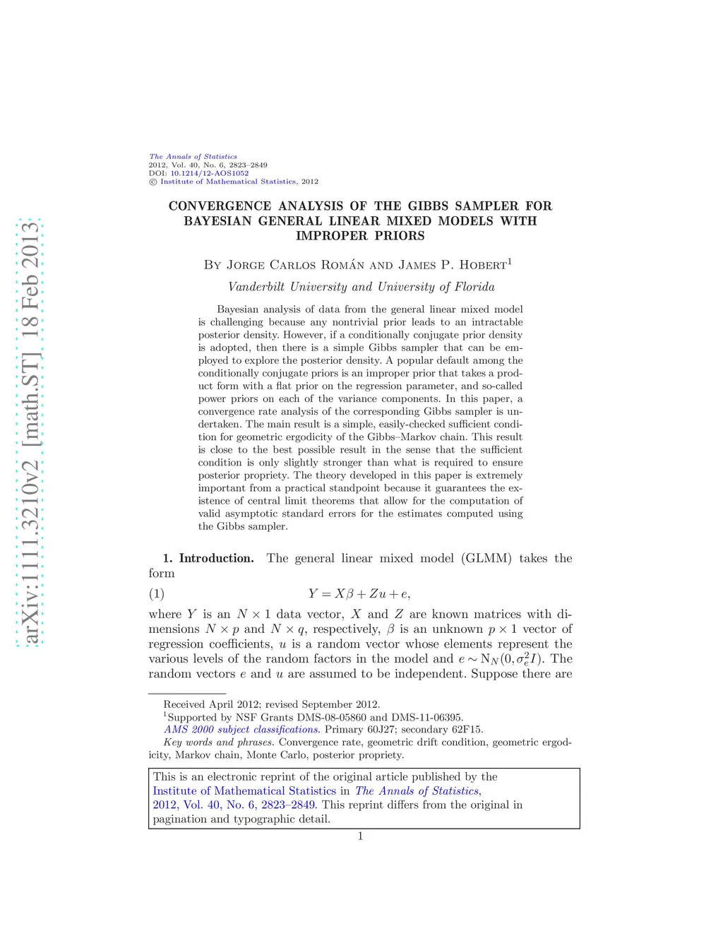 Bayesian analysis of data from the general linear mixed model is challenging because any nontrivial prior leads to an intractable posterior density. However, if a conditionally conjugate prior density is adopted, then there is a simple Gibbs sampler that can be employed to explore the posterior density. A popular default among the conditionally conjugate priors is an improper prior that takes a product form with a flat prior on the regression parameter, and so-called power priors on each of the variance components. In this paper, a convergence rate analysis of the corresponding Gibbs sampler is undertaken. The main result is a simple, easily-checked sufficient condition for geometric ergodicity of the Gibbs-Markov chain. This result is close to the best possible result in the sense that the sufficient condition is only slightly stronger than what is required to ensure posterior propriety. The theory developed in this paper is extremely important from a practical standpoint because it guarantees the existence of central limit theorems that allow for the computation of valid asymptotic standard errors for the estimates computed using the Gibbs sampler.
