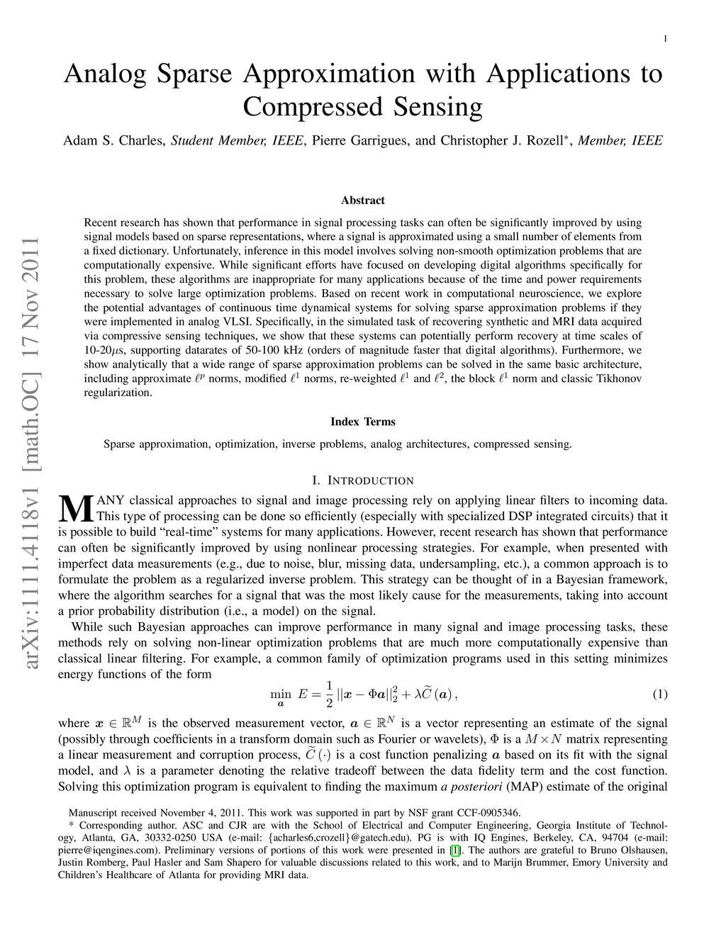 Recent research has shown that performance in signal processing tasks can often be significantly improved by using signal models based on sparse representations, where a signal is approximated using a small number of elements from a fixed dictionary. Unfortunately, inference in this model involves solving non-smooth optimization problems that are computationally expensive. While significant efforts have focused on developing digital algorithms specifically for this problem, these algorithms are inappropriate for many applications because of the time and power requirements necessary to solve large optimization problems. Based on recent work in computational neuroscience, we explore the potential advantages of continuous time dynamical systems for solving sparse approximation problems if they were implemented in analog VLSI. Specifically, in the simulated task of recovering synthetic and MRI data acquired via compressive sensing techniques, we show that these systems can potentially perform recovery at time scales of 10-20{\mu}s, supporting datarates of 50-100 kHz (orders of magnitude faster that digital algorithms). Furthermore, we show analytically that a wide range of sparse approximation problems can be solved in the same basic architecture, including approximate norms, modified norms, re-weighted and , the block norm and classic Tikhonov regularization.