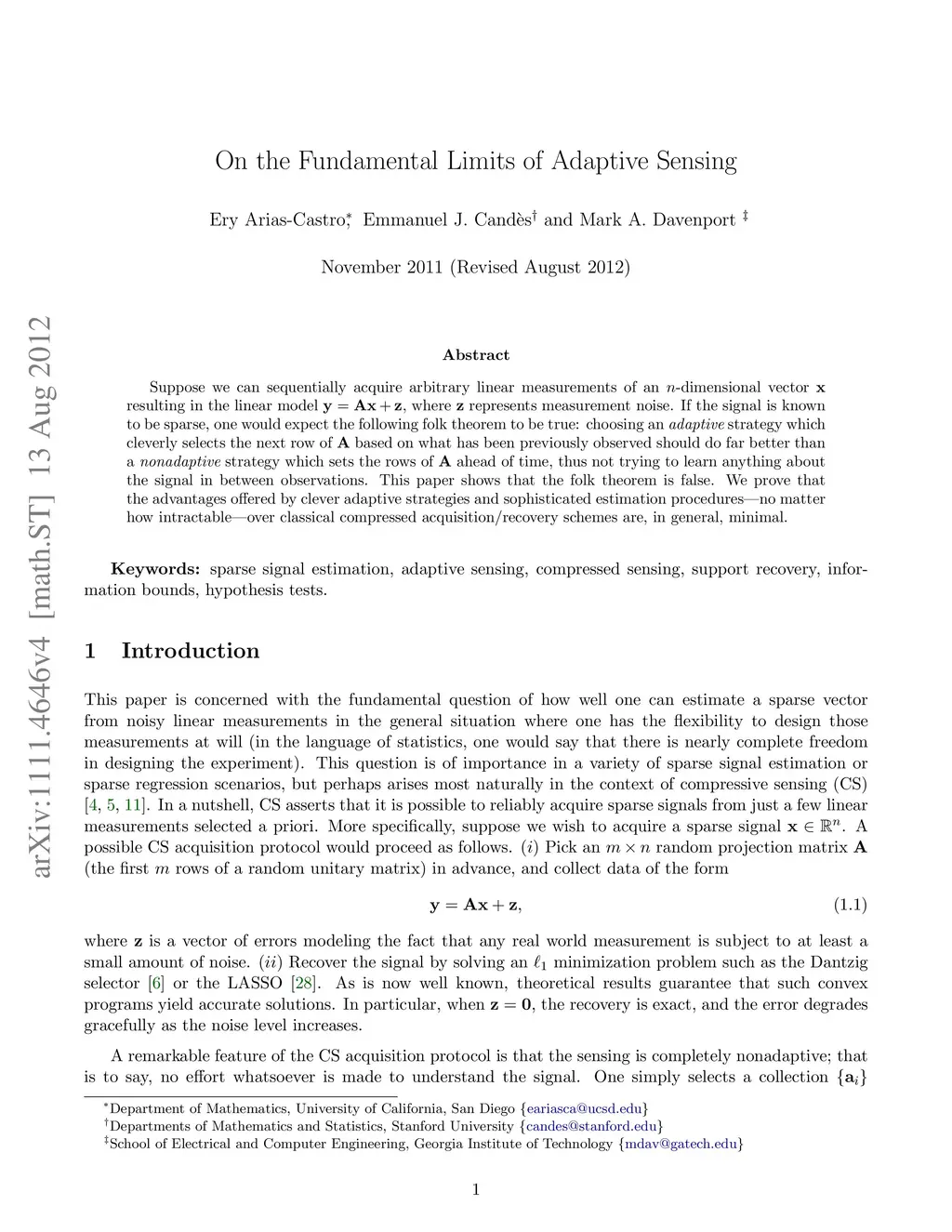 Suppose we can sequentially acquire arbitrary linear measurements of an n-dimensional vector x resulting in the linear model y = Ax + z, where z represents measurement noise. If the signal is known to be sparse, one would expect the following folk theorem to be true: choosing an adaptive strategy which cleverly selects the next row of A based on what has been previously observed should do far better than a nonadaptive strategy which sets the rows of A ahead of time, thus not trying to learn anything about the signal in between observations. This paper shows that the folk theorem is false. We prove that the advantages offered by clever adaptive strategies and sophisticated estimation procedures---no matter how intractable---over classical compressed acquisition/recovery schemes are, in general, minimal.