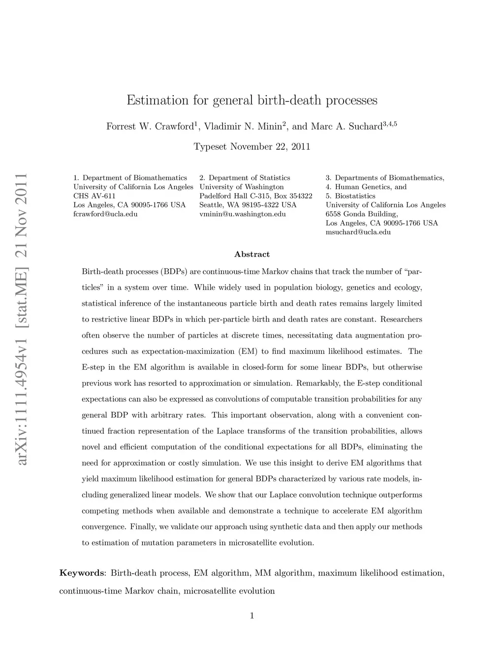 Birth-death processes (BDPs) are continuous-time Markov chains that track the number of "particles" in a system over time. While widely used in population biology, genetics and ecology, statistical inference of the instantaneous particle birth and death rates remains largely limited to restrictive linear BDPs in which per-particle birth and death rates are constant. Researchers often observe the number of particles at discrete times, necessitating data augmentation procedures such as expectation-maximization (EM) to find maximum likelihood estimates. The E-step in the EM algorithm is available in closed-form for some linear BDPs, but otherwise previous work has resorted to approximation or simulation. Remarkably, the E-step conditional expectations can also be expressed as convolutions of computable transition probabilities for any general BDP with arbitrary rates. This important observation, along with a convenient continued fraction representation of the Laplace transforms of the transition probabilities, allows novel and efficient computation of the conditional expectations for all BDPs, eliminating the need for approximation or costly simulation. We use this insight to derive EM algorithms that yield maximum likelihood estimation for general BDPs characterized by various rate models, including generalized linear models. We show that our Laplace convolution technique outperforms competing methods when available and demonstrate a technique to accelerate EM algorithm convergence. Finally, we validate our approach using synthetic data and then apply our methods to estimation of mutation parameters in microsatellite evolution.