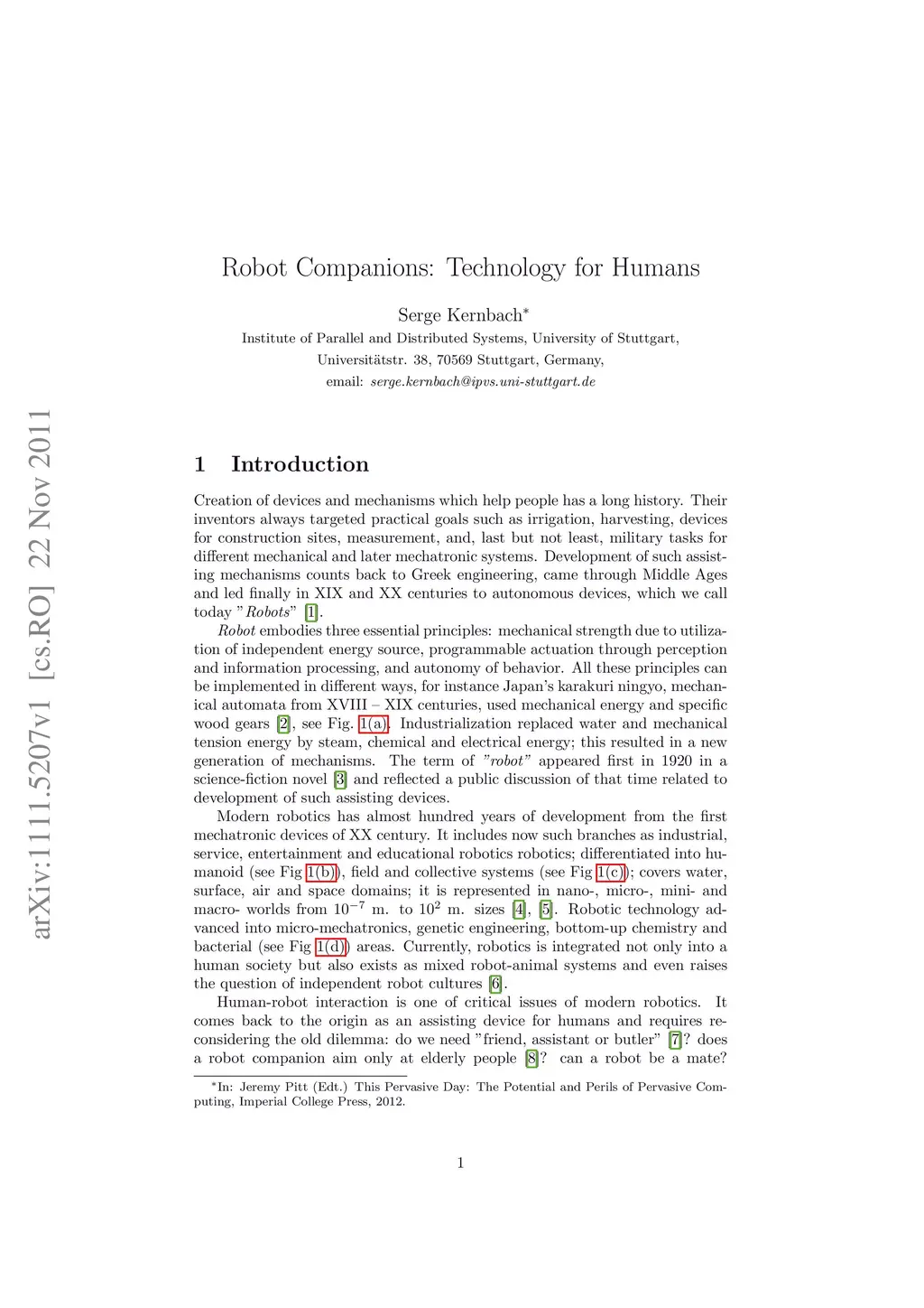 Creation of devices and mechanisms which help people has a long history. Their inventors always targeted practical goals such as irrigation, harvesting, devices for construction sites, measurement, and, last but not least, military tasks for different mechanical and later mechatronic systems. Development of such assisting mechanisms counts back to Greek engineering, came through Middle Ages and led finally in XIX and XX centuries to autonomous devices, which we call today "Robots". This chapter provides overview of several robotic technologies, introduces bio-/chemo- hybrid and collective systems and discuss their applications in service areas.