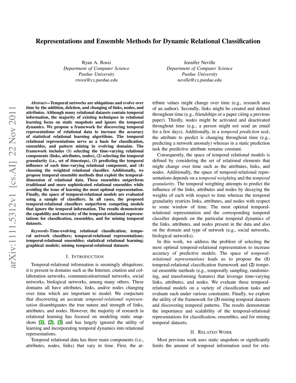 Temporal networks are ubiquitous and evolve over time by the addition, deletion, and changing of links, nodes, and attributes. Although many relational datasets contain temporal information, the majority of existing techniques in relational learning focus on static snapshots and ignore the temporal dynamics. We propose a framework for discovering temporal representations of relational data to increase the accuracy of statistical relational learning algorithms. The temporal relational representations serve as a basis for classification, ensembles, and pattern mining in evolving domains. The framework includes (1) selecting the time-varying relational components (links, attributes, nodes), (2) selecting the temporal granularity, (3) predicting the temporal influence of each time-varying relational component, and (4) choosing the weighted relational classifier. Additionally, we propose temporal ensemble methods that exploit the temporal-dimension of relational data. These ensembles outperform traditional and more sophisticated relational ensembles while avoiding the issue of learning the most optimal representation. Finally, the space of temporal-relational models are evaluated using a sample of classifiers. In all cases, the proposed temporal-relational classifiers outperform competing models that ignore the temporal information. The results demonstrate the capability and necessity of the temporal-relational representations for classification, ensembles, and for mining temporal datasets.
