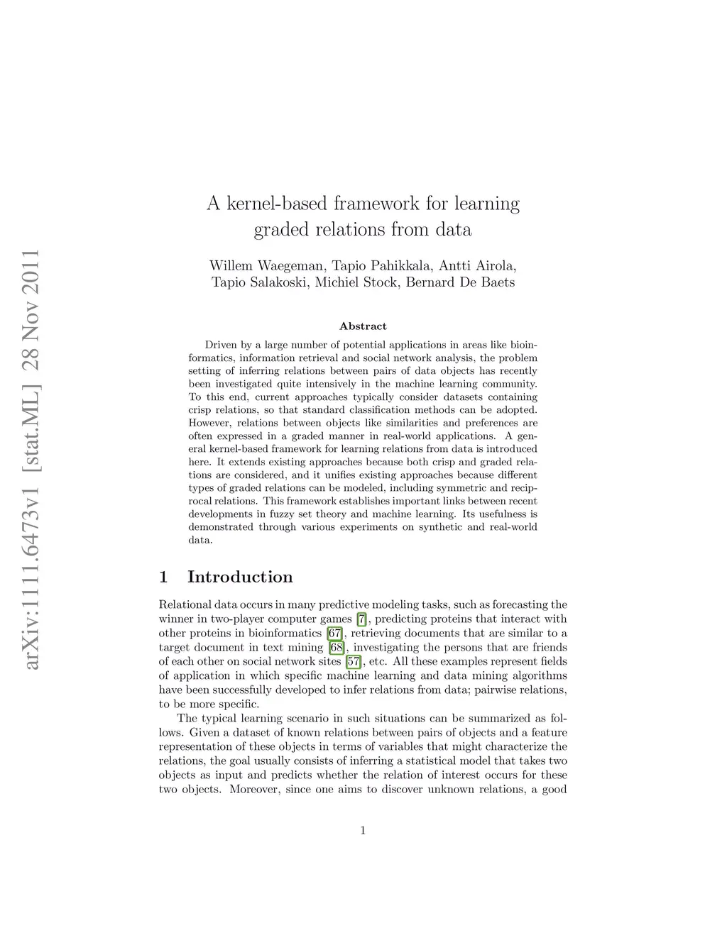 Driven by a large number of potential applications in areas like bioinformatics, information retrieval and social network analysis, the problem setting of inferring relations between pairs of data objects has recently been investigated quite intensively in the machine learning community. To this end, current approaches typically consider datasets containing crisp relations, so that standard classification methods can be adopted. However, relations between objects like similarities and preferences are often expressed in a graded manner in real-world applications. A general kernel-based framework for learning relations from data is introduced here. It extends existing approaches because both crisp and graded relations are considered, and it unifies existing approaches because different types of graded relations can be modeled, including symmetric and reciprocal relations. This framework establishes important links between recent developments in fuzzy set theory and machine learning. Its usefulness is demonstrated through various experiments on synthetic and real-world data.