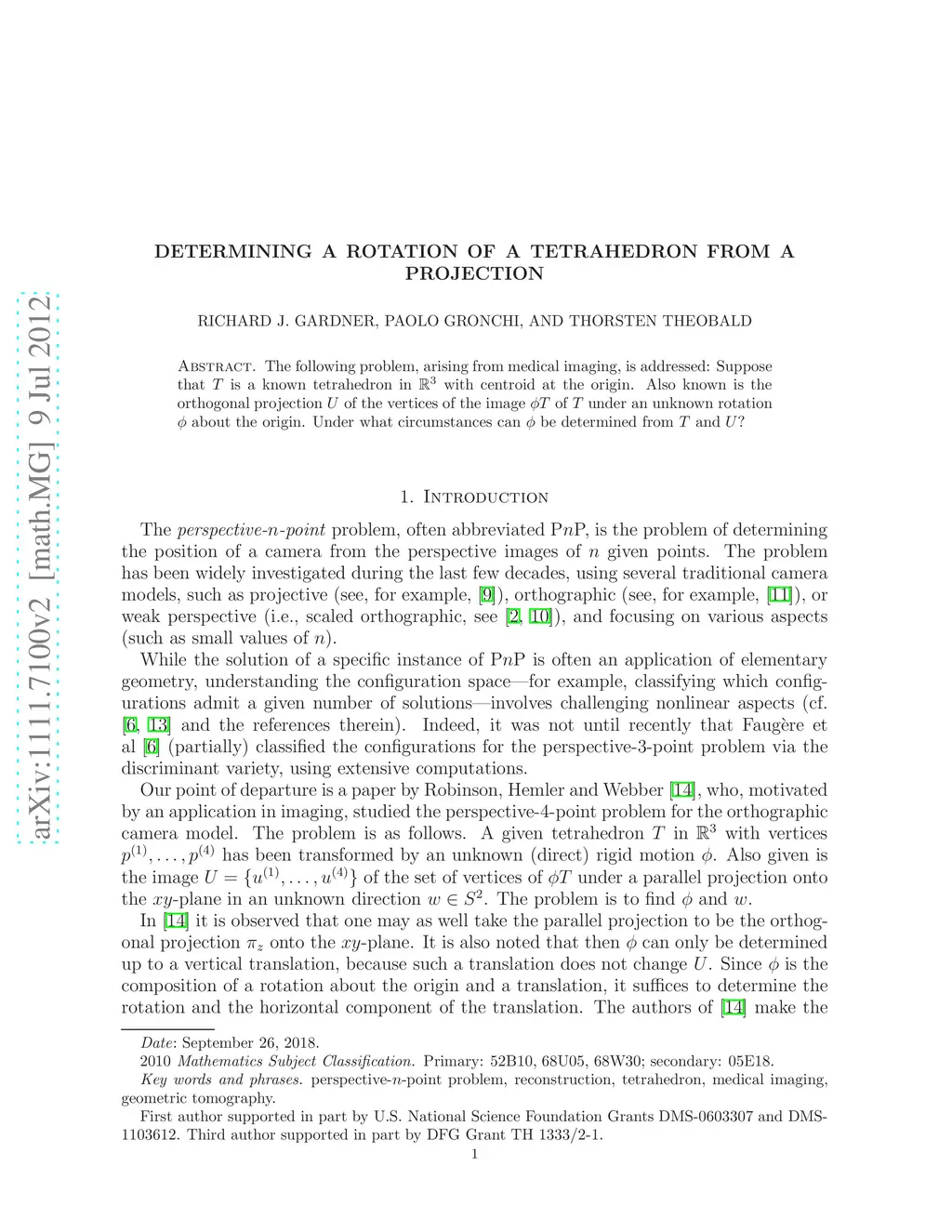 The following problem, arising from medical imaging, is addressed: Suppose that is a known tetrahedron in with centroid at the origin. Also known is the orthogonal projection of the vertices of the image of under an unknown rotation about the origin. Under what circumstances can be determined from and ?