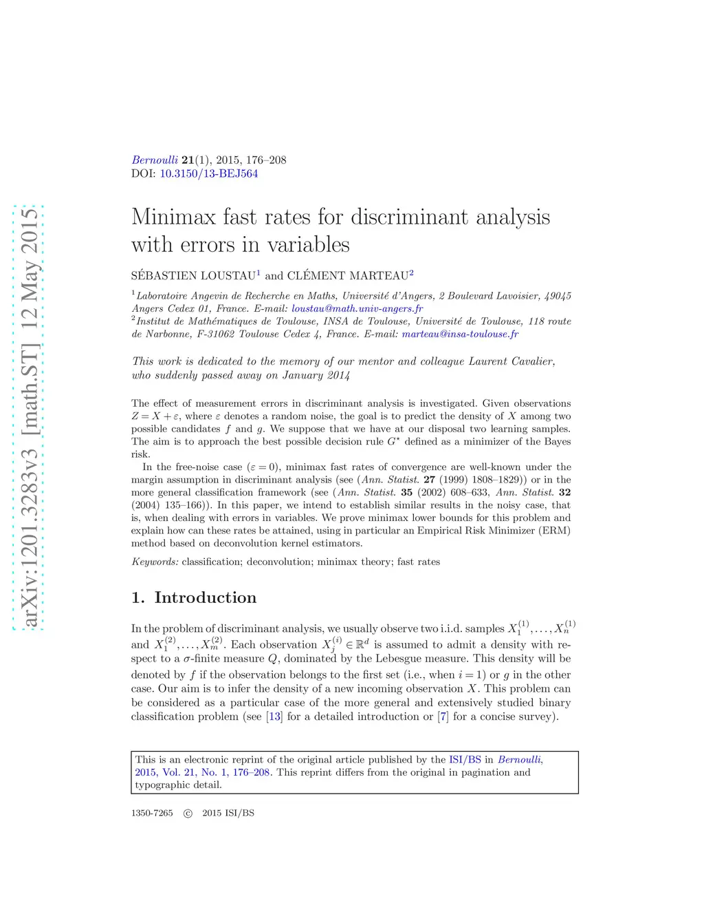 The effect of measurement errors in discriminant analysis is investigated. Given observations , where denotes a random noise, the goal is to predict the density of among two possible candidates and . We suppose that we have at our disposal two learning samples. The aim is to approach the best possible decision rule defined as a minimizer of the Bayes risk. In the free-noise case , minimax fast rates of convergence are well-known under the margin assumption in discriminant analysis (see \cite{mammen}) or in the more general classification framework (see \cite{tsybakov2004,AT}). In this paper we intend to establish similar results in the noisy case, i.e. when dealing with errors in variables. We prove minimax lower bounds for this problem and explain how can these rates be attained, using in particular an Empirical Risk Minimizer (ERM) method based on deconvolution kernel estimators.
