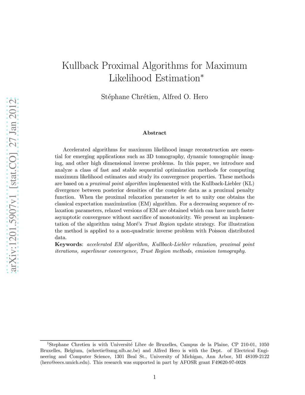 Accelerated algorithms for maximum likelihood image reconstruction are essential for emerging applications such as 3D tomography, dynamic tomographic imaging, and other high dimensional inverse problems. In this paper, we introduce and analyze a class of fast and stable sequential optimization methods for computing maximum likelihood estimates and study its convergence properties. These methods are based on a {\it proximal point algorithm} implemented with the Kullback-Liebler (KL) divergence between posterior densities of the complete data as a proximal penalty function. When the proximal relaxation parameter is set to unity one obtains the classical expectation maximization (EM) algorithm. For a decreasing sequence of relaxation parameters, relaxed versions of EM are obtained which can have much faster asymptotic convergence without sacrifice of monotonicity. We present an implementation of the algorithm using Mor\'{e}'s {\it Trust Region} update strategy. For illustration the method is applied to a non-quadratic inverse problem with Poisson distributed data.