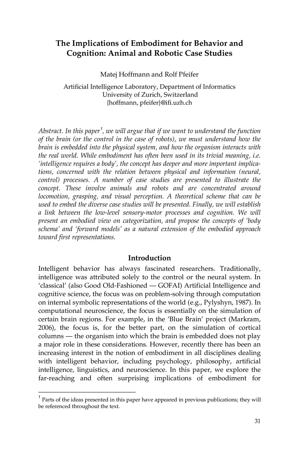 In this paper, we will argue that if we want to understand the function of the brain (or the control in the case of robots), we must understand how the brain is embedded into the physical system, and how the organism interacts with the real world. While embodiment has often been used in its trivial meaning, i.e. íntelligence requires a body', the concept has deeper and more important implications, concerned with the relation between physical and information (neural, control) processes. A number of case studies are presented to illustrate the concept. These involve animals and robots and are concentrated around locomotion, grasping, and visual perception. A theoretical scheme that can be used to embed the diverse case studies will be presented. Finally, we will establish a link between the low-level sensory-motor processes and cognition. We will present an embodied view on categorization, and propose the concepts of 'body schema' and 'forward models' as a natural extension of the embodied approach toward first representations.