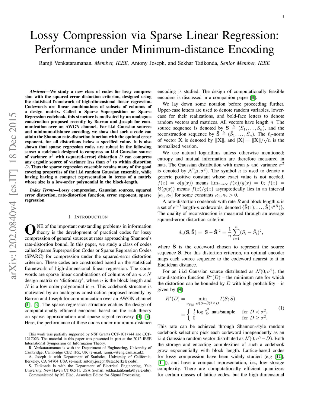 We study a new class of codes for lossy compression with the squared-error distortion criterion, designed using the statistical framework of high-dimensional linear regression. Codewords are linear combinations of subsets of columns of a design matrix. Called a Sparse Superposition or Sparse Regression codebook, this structure is motivated by an analogous construction proposed recently by Barron and Joseph for communication over an AWGN channel. For i.i.d Gaussian sources and minimum-distance encoding, we show that such a code can attain the Shannon rate-distortion function with the optimal error exponent, for all distortions below a specified value. It is also shown that sparse regression codes are robust in the following sense: a codebook designed to compress an i.i.d Gaussian source of variance with (squared-error) distortion can compress any ergodic source of variance less than to within distortion . Thus the sparse regression ensemble retains many of the good covering properties of the i.i.d random Gaussian ensemble, while having having a compact representation in terms of a matrix whose size is a low-order polynomial in the block-length.