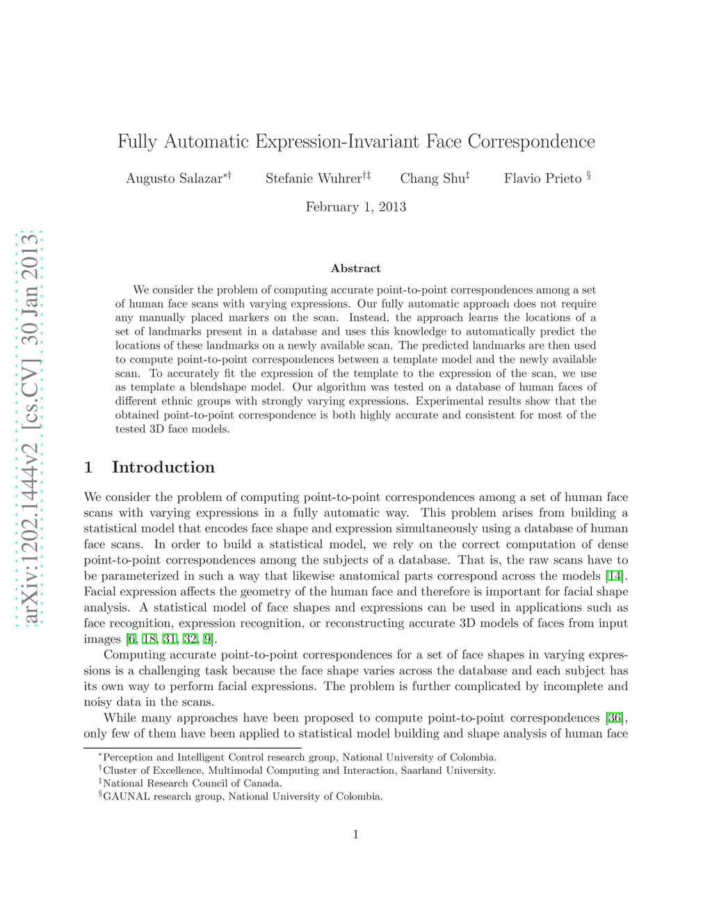 We consider the problem of computing accurate point-to-point correspondences among a set of human face scans with varying expressions. Our fully automatic approach does not require any manually placed markers on the scan. Instead, the approach learns the locations of a set of landmarks present in a database and uses this knowledge to automatically predict the locations of these landmarks on a newly available scan. The predicted landmarks are then used to compute point-to-point correspondences between a template model and the newly available scan. To accurately fit the expression of the template to the expression of the scan, we use as template a blendshape model. Our algorithm was tested on a database of human faces of different ethnic groups with strongly varying expressions. Experimental results show that the obtained point-to-point correspondence is both highly accurate and consistent for most of the tested 3D face models.