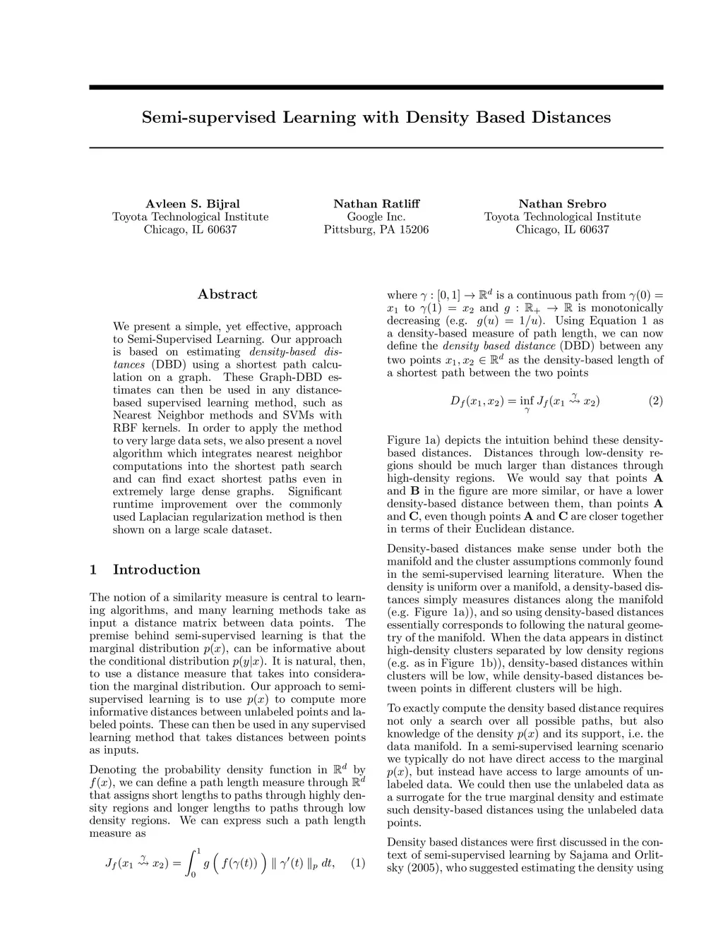 We present a simple, yet effective, approach to Semi-Supervised Learning. Our approach is based on estimating density-based distances (DBD) using a shortest path calculation on a graph. These Graph-DBD estimates can then be used in any distance-based supervised learning method, such as Nearest Neighbor methods and SVMs with RBF kernels. In order to apply the method to very large data sets, we also present a novel algorithm which integrates nearest neighbor computations into the shortest path search and can find exact shortest paths even in extremely large dense graphs. Significant runtime improvement over the commonly used Laplacian regularization method is then shown on a large scale dataset.
