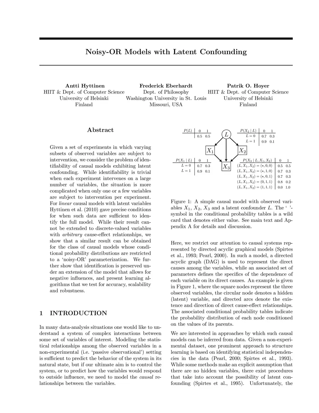 Given a set of experiments in which varying subsets of observed variables are subject to intervention, we consider the problem of identifiability of causal models exhibiting latent confounding. While identifiability is trivial when each experiment intervenes on a large number of variables, the situation is more complicated when only one or a few variables are subject to intervention per experiment. For linear causal models with latent variables Hyttinen et al. (2010) gave precise conditions for when such data are sufficient to identify the full model. While their result cannot be extended to discrete-valued variables with arbitrary cause-effect relationships, we show that a similar result can be obtained for the class of causal models whose conditional probability distributions are restricted to a `noisy-OR' parameterization. We further show that identification is preserved under an extension of the model that allows for negative influences, and present learning algorithms that we test for accuracy, scalability and robustness.