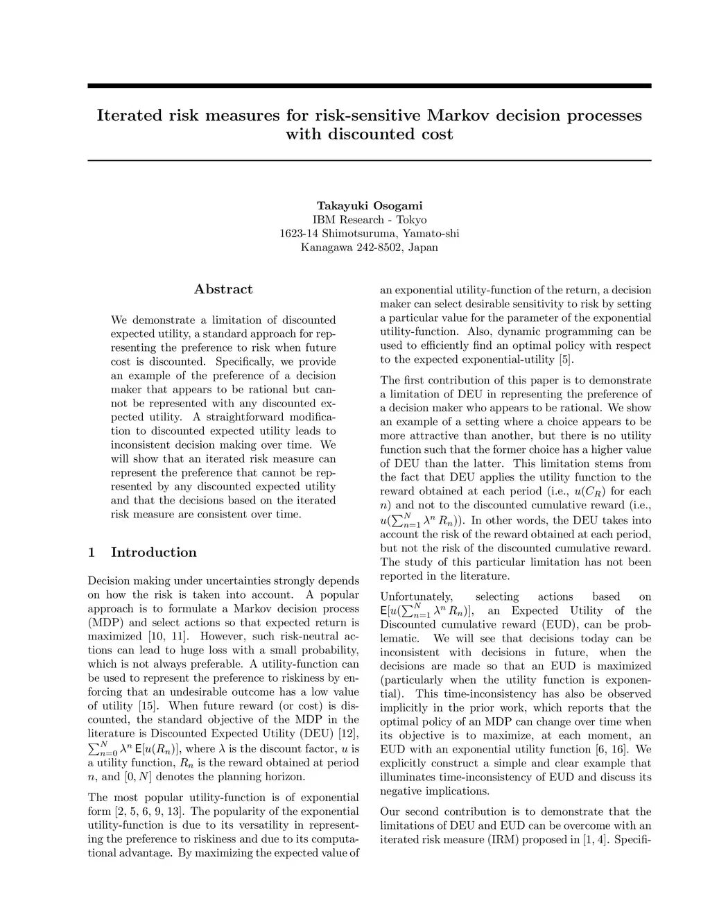 We demonstrate a limitation of discounted expected utility, a standard approach for representing the preference to risk when future cost is discounted. Specifically, we provide an example of the preference of a decision maker that appears to be rational but cannot be represented with any discounted expected utility. A straightforward modification to discounted expected utility leads to inconsistent decision making over time. We will show that an iterated risk measure can represent the preference that cannot be represented by any discounted expected utility and that the decisions based on the iterated risk measure are consistent over time.