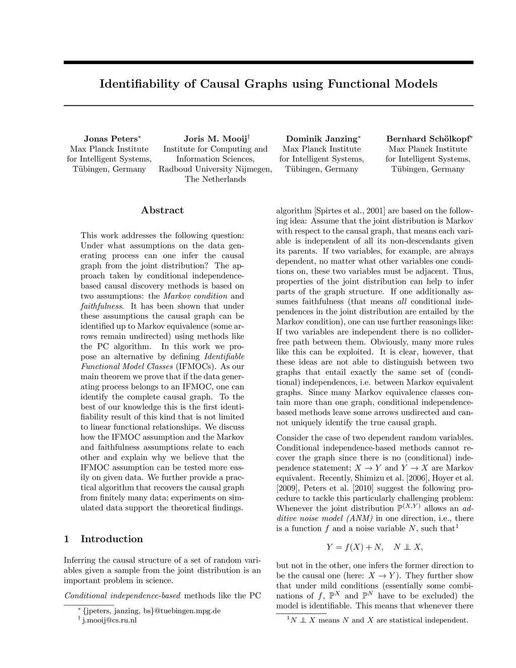 This work addresses the following question: Under what assumptions on the data generating process can one infer the causal graph from the joint distribution? The approach taken by conditional independence-based causal discovery methods is based on two assumptions: the Markov condition and faithfulness. It has been shown that under these assumptions the causal graph can be identified up to Markov equivalence (some arrows remain undirected) using methods like the PC algorithm. In this work we propose an alternative by defining Identifiable Functional Model Classes (IFMOCs). As our main theorem we prove that if the data generating process belongs to an IFMOC, one can identify the complete causal graph. To the best of our knowledge this is the first identifiability result of this kind that is not limited to linear functional relationships. We discuss how the IFMOC assumption and the Markov and faithfulness assumptions relate to each other and explain why we believe that the IFMOC assumption can be tested more easily on given data. We further provide a practical algorithm that recovers the causal graph from finitely many data; experiments on simulated data support the theoretical findings.