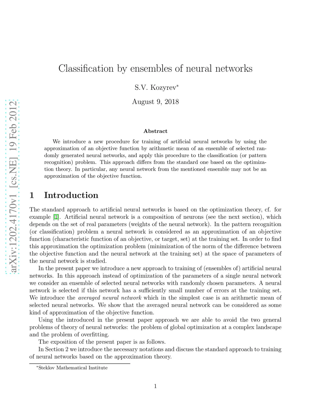 Classification by Ensembles of Neural Networks