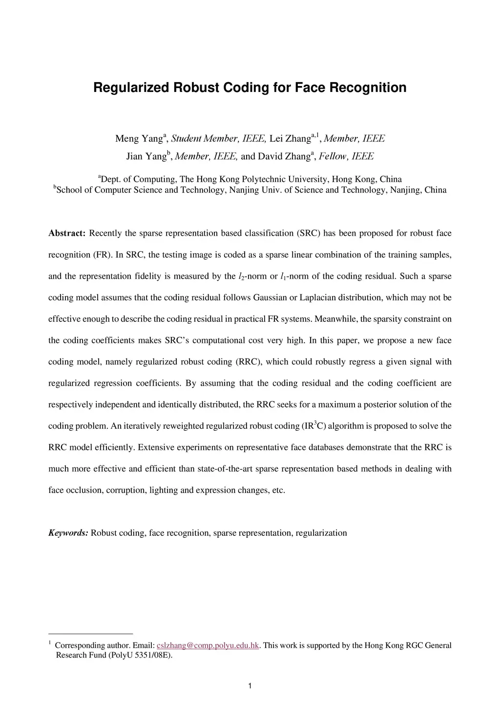 Recently the sparse representation based classification (SRC) has been proposed for robust face recognition (FR). In SRC, the testing image is coded as a sparse linear combination of the training samples, and the representation fidelity is measured by the l2-norm or l1-norm of the coding residual. Such a sparse coding model assumes that the coding residual follows Gaussian or Laplacian distribution, which may not be effective enough to describe the coding residual in practical FR systems. Meanwhile, the sparsity constraint on the coding coefficients makes SRC's computational cost very high. In this paper, we propose a new face coding model, namely regularized robust coding (RRC), which could robustly regress a given signal with regularized regression coefficients. By assuming that the coding residual and the coding coefficient are respectively independent and identically distributed, the RRC seeks for a maximum a posterior solution of the coding problem. An iteratively reweighted regularized robust coding (IR3C) algorithm is proposed to solve the RRC model efficiently. Extensive experiments on representative face databases demonstrate that the RRC is much more effective and efficient than state-of-the-art sparse representation based methods in dealing with face occlusion, corruption, lighting and expression changes, etc.