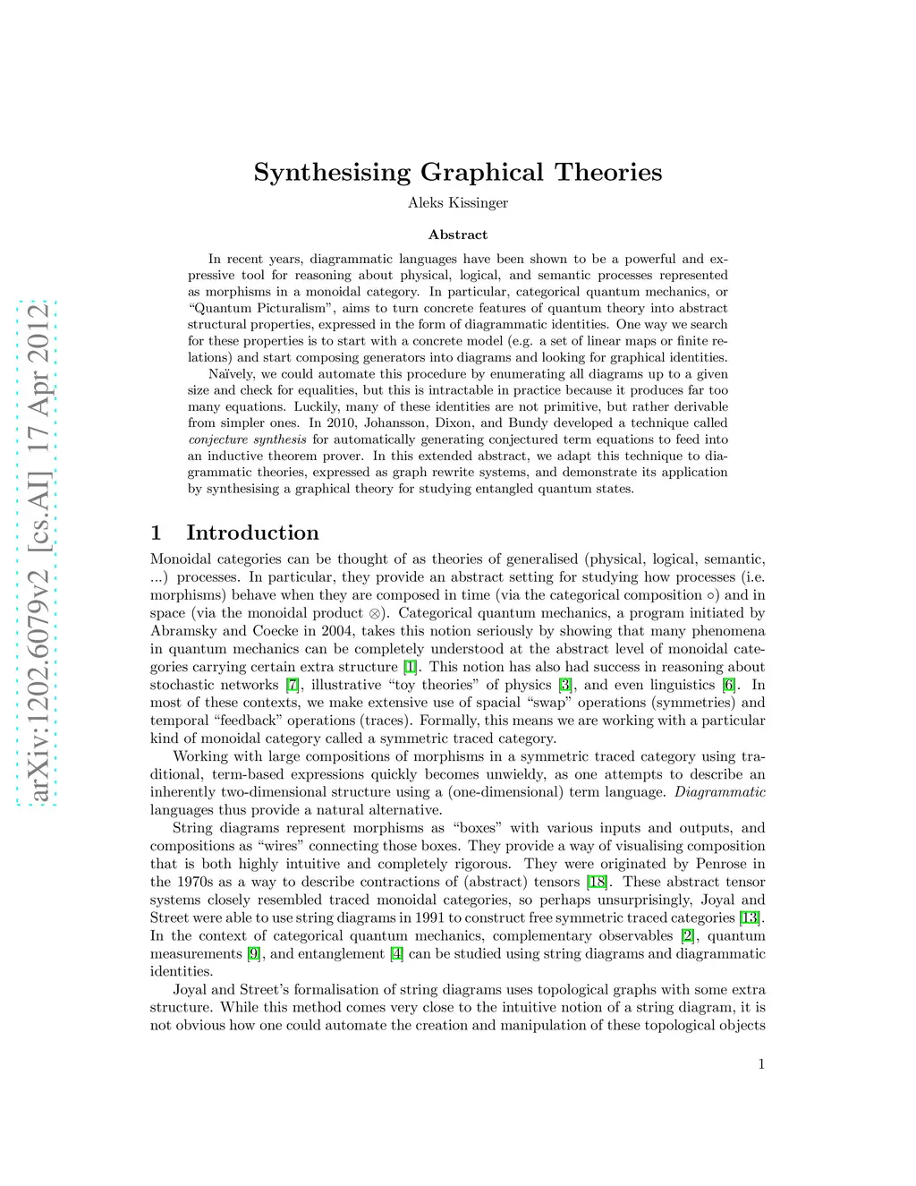 In recent years, diagrammatic languages have been shown to be a powerful and expressive tool for reasoning about physical, logical, and semantic processes represented as morphisms in a monoidal category. In particular, categorical quantum mechanics, or "Quantum Picturalism", aims to turn concrete features of quantum theory into abstract structural properties, expressed in the form of diagrammatic identities. One way we search for these properties is to start with a concrete model (e.g. a set of linear maps or finite relations) and start composing generators into diagrams and looking for graphical identities. Naively, we could automate this procedure by enumerating all diagrams up to a given size and check for equalities, but this is intractable in practice because it produces far too many equations. Luckily, many of these identities are not primitive, but rather derivable from simpler ones. In 2010, Johansson, Dixon, and Bundy developed a technique called conjecture synthesis for automatically generating conjectured term equations to feed into an inductive theorem prover. In this extended abstract, we adapt this technique to diagrammatic theories, expressed as graph rewrite systems, and demonstrate its application by synthesising a graphical theory for studying entangled quantum states.