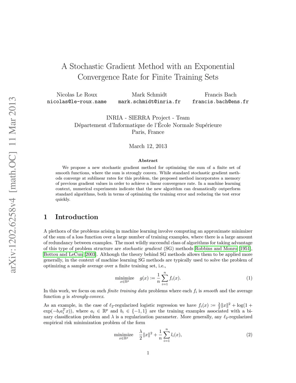 We propose a new stochastic gradient method for optimizing the sum of a finite set of smooth functions, where the sum is strongly convex. While standard stochastic gradient methods converge at sublinear rates for this problem, the proposed method incorporates a memory of previous gradient values in order to achieve a linear convergence rate. In a machine learning context, numerical experiments indicate that the new algorithm can dramatically outperform standard algorithms, both in terms of optimizing the training error and reducing the test error quickly.