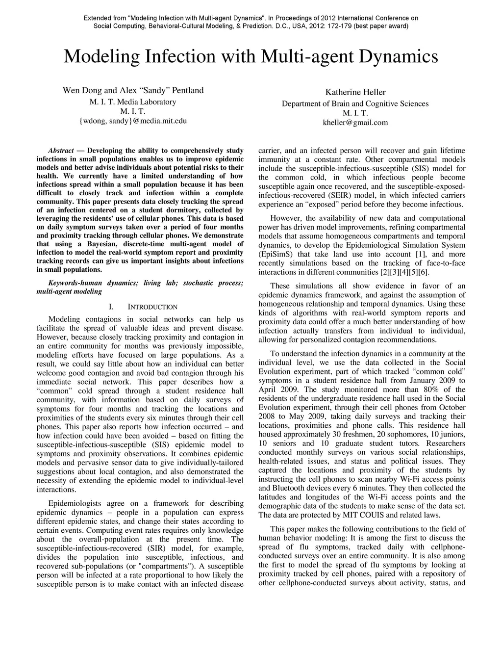 Developing the ability to comprehensively study infections in small populations enables us to improve epidemic models and better advise individuals about potential risks to their health. We currently have a limited understanding of how infections spread within a small population because it has been difficult to closely track an infection within a complete community. The paper presents data closely tracking the spread of an infection centered on a student dormitory, collected by leveraging the residents' use of cellular phones. The data are based on daily symptom surveys taken over a period of four months and proximity tracking through cellular phones. We demonstrate that using a Bayesian, discrete-time multi-agent model of infection to model real-world symptom reports and proximity tracking records gives us important insights about infec-tions in small populations.