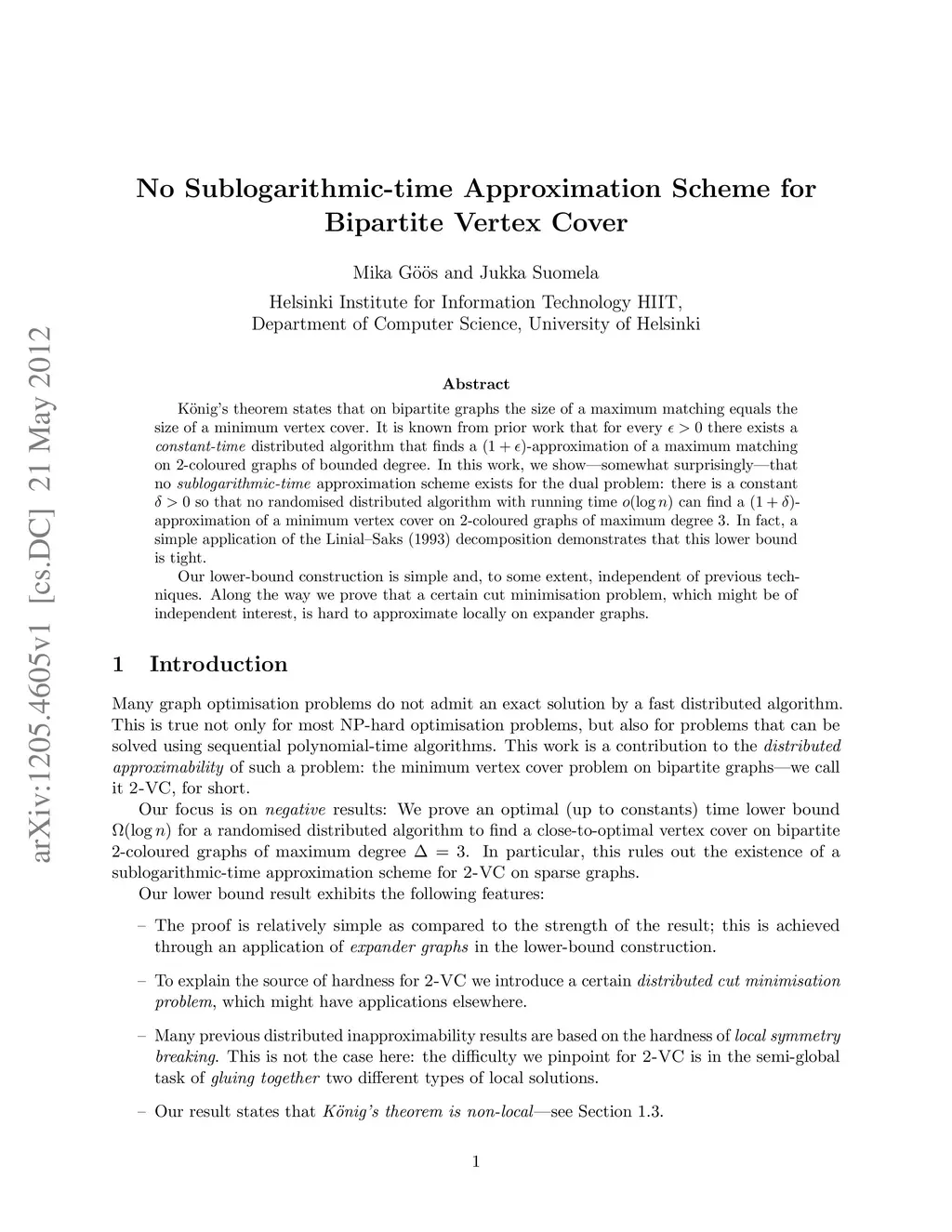K\"onig's theorem states that on bipartite graphs the size of a maximum matching equals the size of a minimum vertex cover. It is known from prior work that for every \epsilon > 0 there exists a constant-time distributed algorithm that finds a (1+\epsilon)-approximation of a maximum matching on 2-coloured graphs of bounded degree. In this work, we show---somewhat surprisingly---that no sublogarithmic-time approximation scheme exists for the dual problem: there is a constant \delta > 0 so that no randomised distributed algorithm with running time o(\log n) can find a (1+\delta)-approximation of a minimum vertex cover on 2-coloured graphs of maximum degree 3. In fact, a simple application of the Linial--Saks (1993) decomposition demonstrates that this lower bound is tight. Our lower-bound construction is simple and, to some extent, independent of previous techniques. Along the way we prove that a certain cut minimisation problem, which might be of independent interest, is hard to approximate locally on expander graphs.