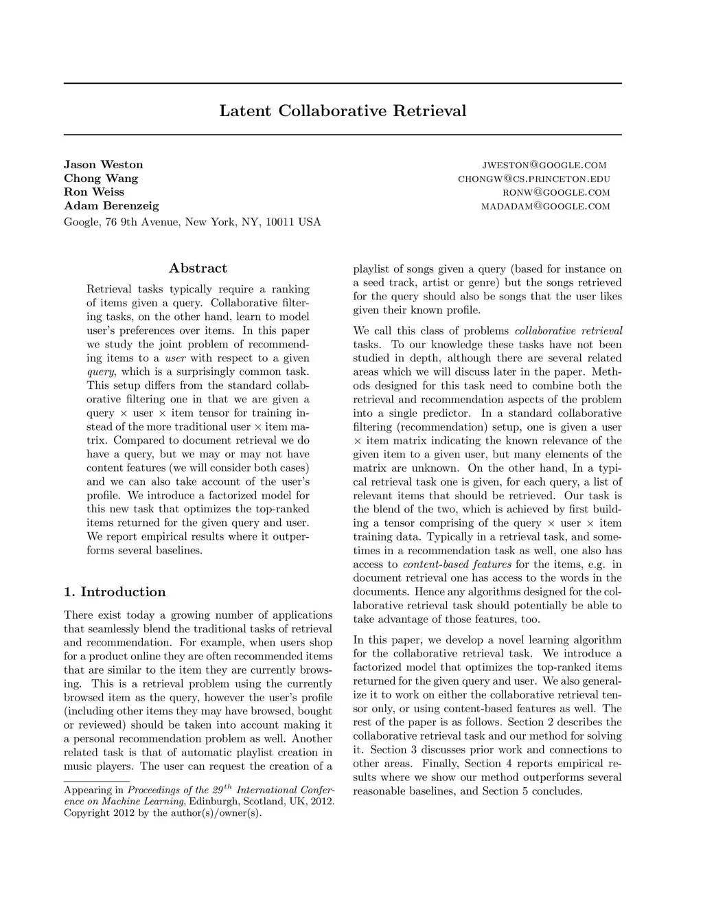 Retrieval tasks typically require a ranking of items given a query. Collaborative filtering tasks, on the other hand, learn to model user's preferences over items. In this paper we study the joint problem of recommending items to a user with respect to a given query, which is a surprisingly common task. This setup differs from the standard collaborative filtering one in that we are given a query x user x item tensor for training instead of the more traditional user x item matrix. Compared to document retrieval we do have a query, but we may or may not have content features (we will consider both cases) and we can also take account of the user's profile. We introduce a factorized model for this new task that optimizes the top-ranked items returned for the given query and user. We report empirical results where it outperforms several baselines.