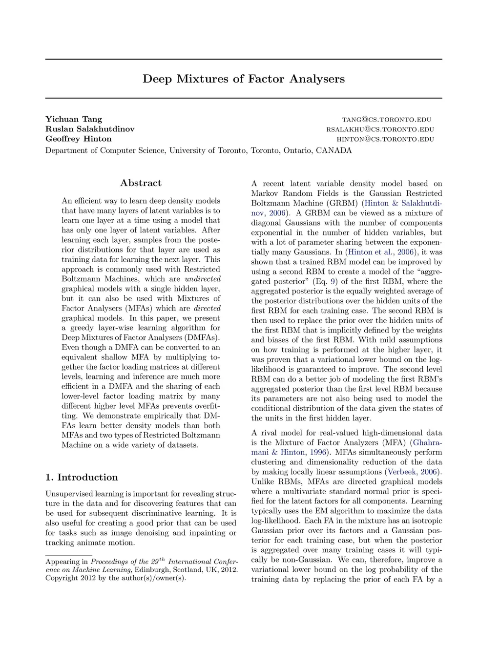 An efficient way to learn deep density models that have many layers of latent variables is to learn one layer at a time using a model that has only one layer of latent variables. After learning each layer, samples from the posterior distributions for that layer are used as training data for learning the next layer. This approach is commonly used with Restricted Boltzmann Machines, which are undirected graphical models with a single hidden layer, but it can also be used with Mixtures of Factor Analysers (MFAs) which are directed graphical models. In this paper, we present a greedy layer-wise learning algorithm for Deep Mixtures of Factor Analysers (DMFAs). Even though a DMFA can be converted to an equivalent shallow MFA by multiplying together the factor loading matrices at different levels, learning and inference are much more efficient in a DMFA and the sharing of each lower-level factor loading matrix by many different higher level MFAs prevents overfitting. We demonstrate empirically that DMFAs learn better density models than both MFAs and two types of Restricted Boltzmann Machine on a wide variety of datasets.