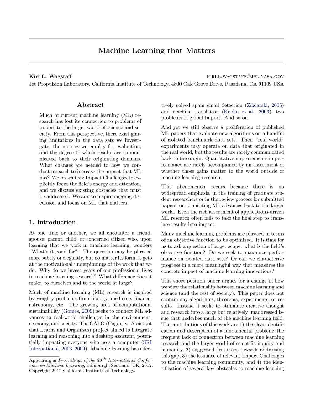 Much of current machine learning (ML) research has lost its connection to problems of import to the larger world of science and society. From this perspective, there exist glaring limitations in the data sets we investigate, the metrics we employ for evaluation, and the degree to which results are communicated back to their originating domains. What changes are needed to how we conduct research to increase the impact that ML has? We present six Impact Challenges to explicitly focus the field?s energy and attention, and we discuss existing obstacles that must be addressed. We aim to inspire ongoing discussion and focus on ML that matters.