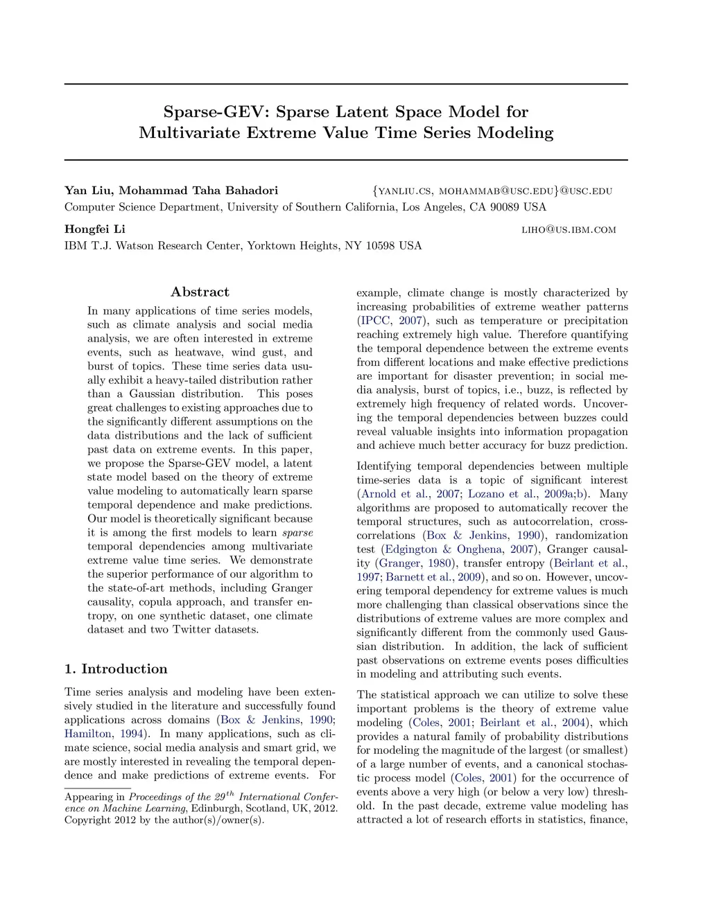 In many applications of time series models, such as climate analysis and social media analysis, we are often interested in extreme events, such as heatwave, wind gust, and burst of topics. These time series data usually exhibit a heavy-tailed distribution rather than a Gaussian distribution. This poses great challenges to existing approaches due to the significantly different assumptions on the data distributions and the lack of sufficient past data on extreme events. In this paper, we propose the Sparse-GEV model, a latent state model based on the theory of extreme value modeling to automatically learn sparse temporal dependence and make predictions. Our model is theoretically significant because it is among the first models to learn sparse temporal dependencies among multivariate extreme value time series. We demonstrate the superior performance of our algorithm to the state-of-art methods, including Granger causality, copula approach, and transfer entropy, on one synthetic dataset, one climate dataset and two Twitter datasets.