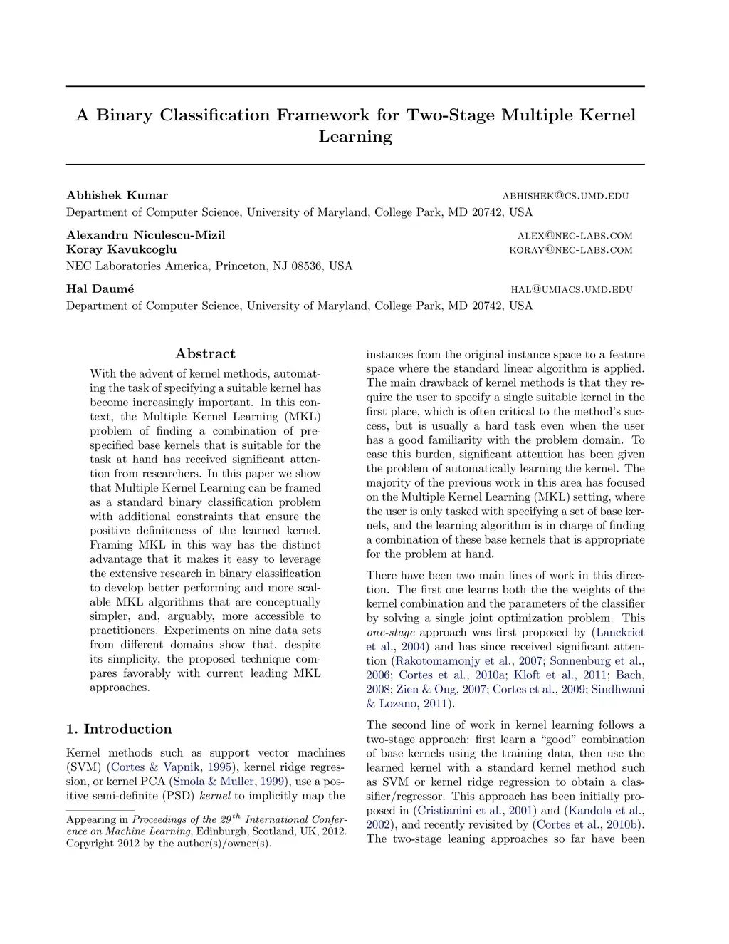 A Binary Classification Framework for Two-Stage Multiple Kernel Learning
