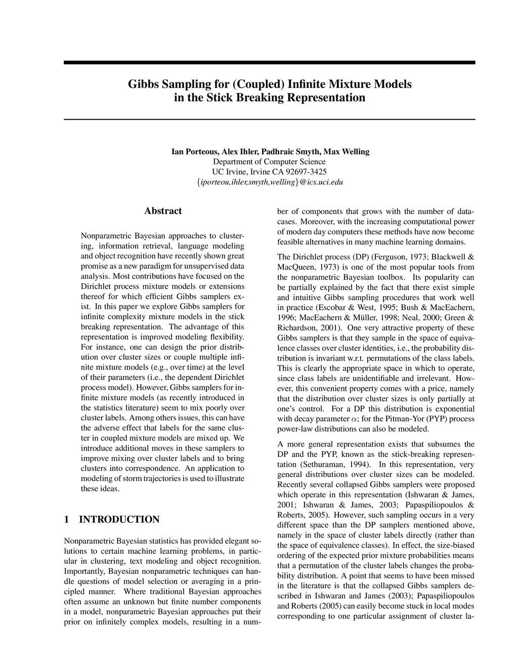 Nonparametric Bayesian approaches to clustering, information retrieval, language modeling and object recognition have recently shown great promise as a new paradigm for unsupervised data analysis. Most contributions have focused on the Dirichlet process mixture models or extensions thereof for which efficient Gibbs samplers exist. In this paper we explore Gibbs samplers for infinite complexity mixture models in the stick breaking representation. The advantage of this representation is improved modeling flexibility. For instance, one can design the prior distribution over cluster sizes or couple multiple infinite mixture models (e.g. over time) at the level of their parameters (i.e. the dependent Dirichlet process model). However, Gibbs samplers for infinite mixture models (as recently introduced in the statistics literature) seem to mix poorly over cluster labels. Among others issues, this can have the adverse effect that labels for the same cluster in coupled mixture models are mixed up. We introduce additional moves in these samplers to improve mixing over cluster labels and to bring clusters into correspondence. An application to modeling of storm trajectories is used to illustrate these ideas.