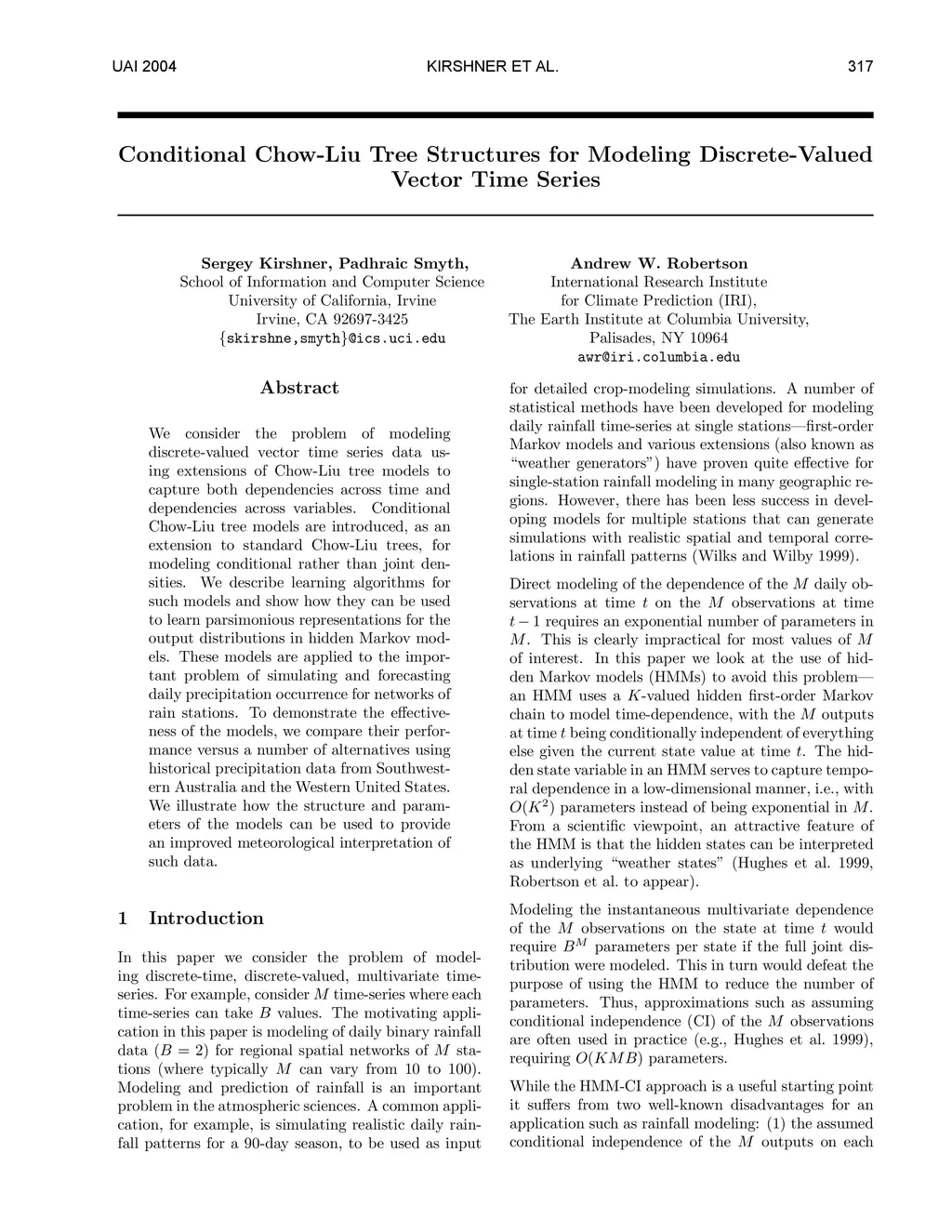 We consider the problem of modeling discrete-valued vector time series data using extensions of Chow-Liu tree models to capture both dependencies across time and dependencies across variables. Conditional Chow-Liu tree models are introduced, as an extension to standard Chow-Liu trees, for modeling conditional rather than joint densities. We describe learning algorithms for such models and show how they can be used to learn parsimonious representations for the output distributions in hidden Markov models. These models are applied to the important problem of simulating and forecasting daily precipitation occurrence for networks of rain stations. To demonstrate the effectiveness of the models, we compare their performance versus a number of alternatives using historical precipitation data from Southwestern Australia and the Western United States. We illustrate how the structure and parameters of the models can be used to provide an improved meteorological interpretation of such data.