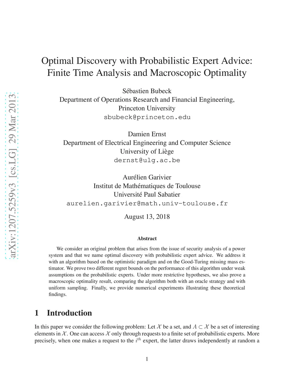 We consider an original problem that arises from the issue of security analysis of a power system and that we name optimal discovery with probabilistic expert advice. We address it with an algorithm based on the optimistic paradigm and on the Good-Turing missing mass estimator. We prove two different regret bounds on the performance of this algorithm under weak assumptions on the probabilistic experts. Under more restrictive hypotheses, we also prove a macroscopic optimality result, comparing the algorithm both with an oracle strategy and with uniform sampling. Finally, we provide numerical experiments illustrating these theoretical findings.