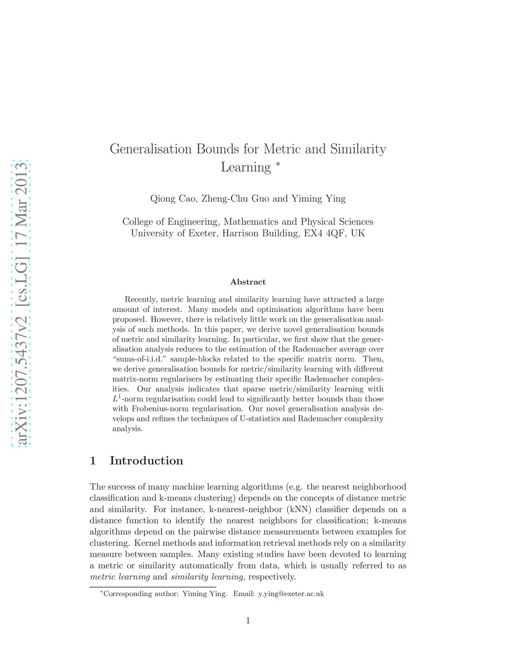Recently, metric learning and similarity learning have attracted a large amount of interest. Many models and optimisation algorithms have been proposed. However, there is relatively little work on the generalization analysis of such methods. In this paper, we derive novel generalization bounds of metric and similarity learning. In particular, we first show that the generalization analysis reduces to the estimation of the Rademacher average over "sums-of-i.i.d." sample-blocks related to the specific matrix norm. Then, we derive generalization bounds for metric/similarity learning with different matrix-norm regularisers by estimating their specific Rademacher complexities. Our analysis indicates that sparse metric/similarity learning with -norm regularisation could lead to significantly better bounds than those with Frobenius-norm regularisation. Our novel generalization analysis develops and refines the techniques of U-statistics and Rademacher complexity analysis.