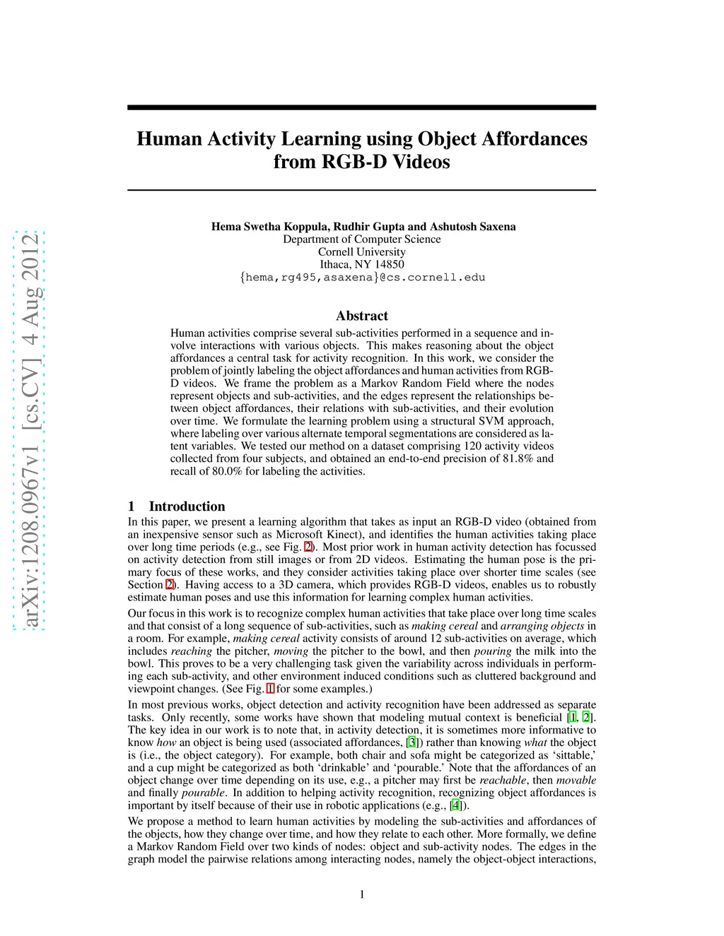Human Activity Learning using Object Affordances from RGB-D Videos