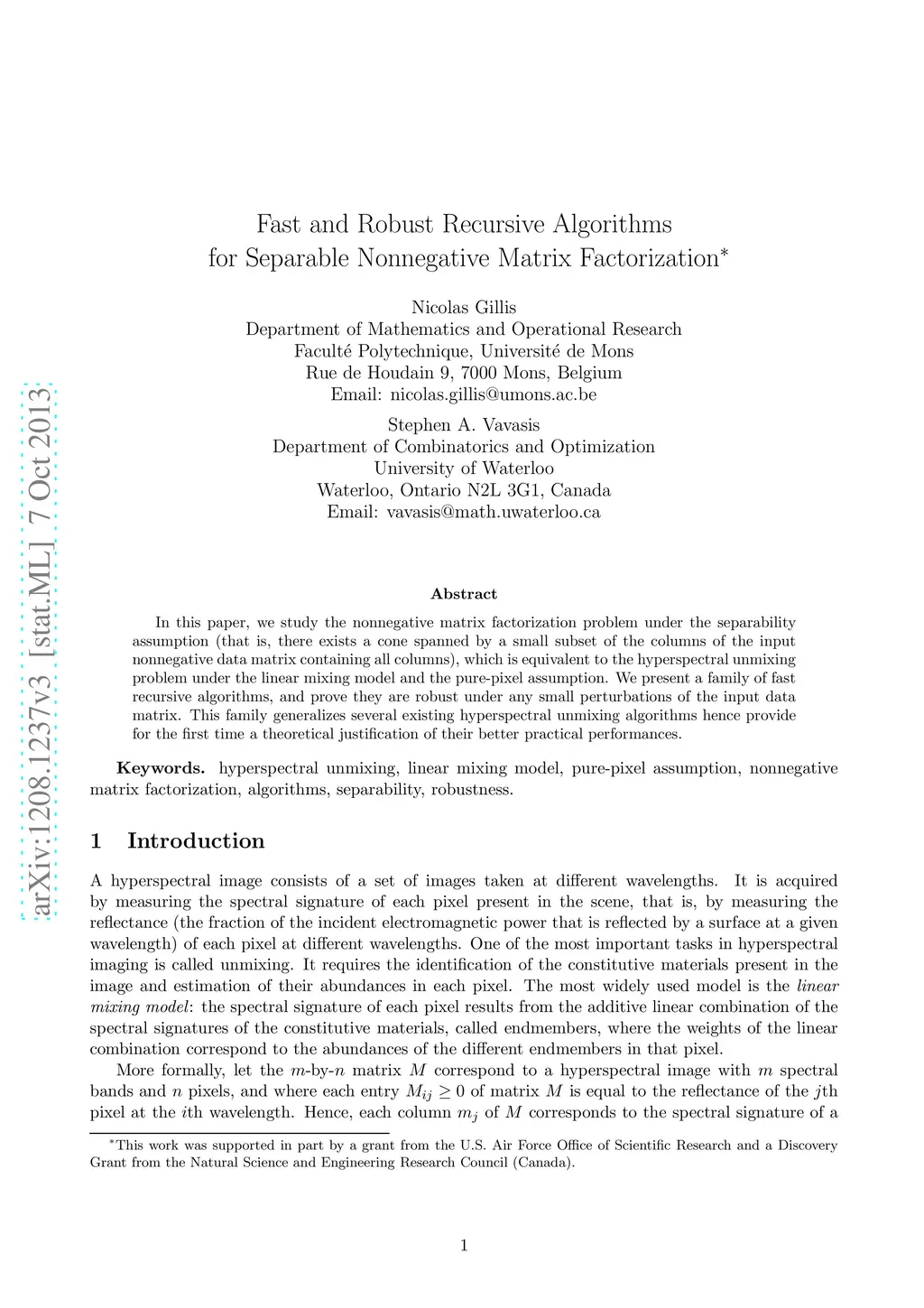 In this paper, we study the nonnegative matrix factorization problem under the separability assumption (that is, there exists a cone spanned by a small subset of the columns of the input nonnegative data matrix containing all columns), which is equivalent to the hyperspectral unmixing problem under the linear mixing model and the pure-pixel assumption. We present a family of fast recursive algorithms, and prove they are robust under any small perturbations of the input data matrix. This family generalizes several existing hyperspectral unmixing algorithms and hence provides for the first time a theoretical justification of their better practical performance.